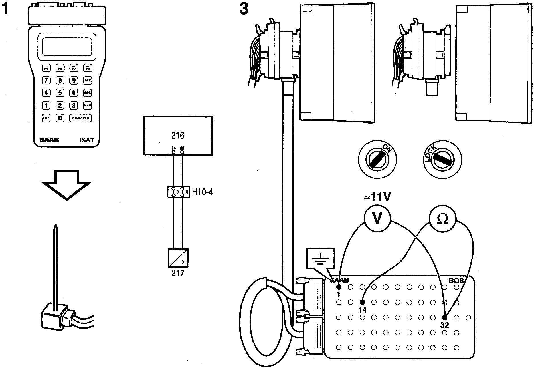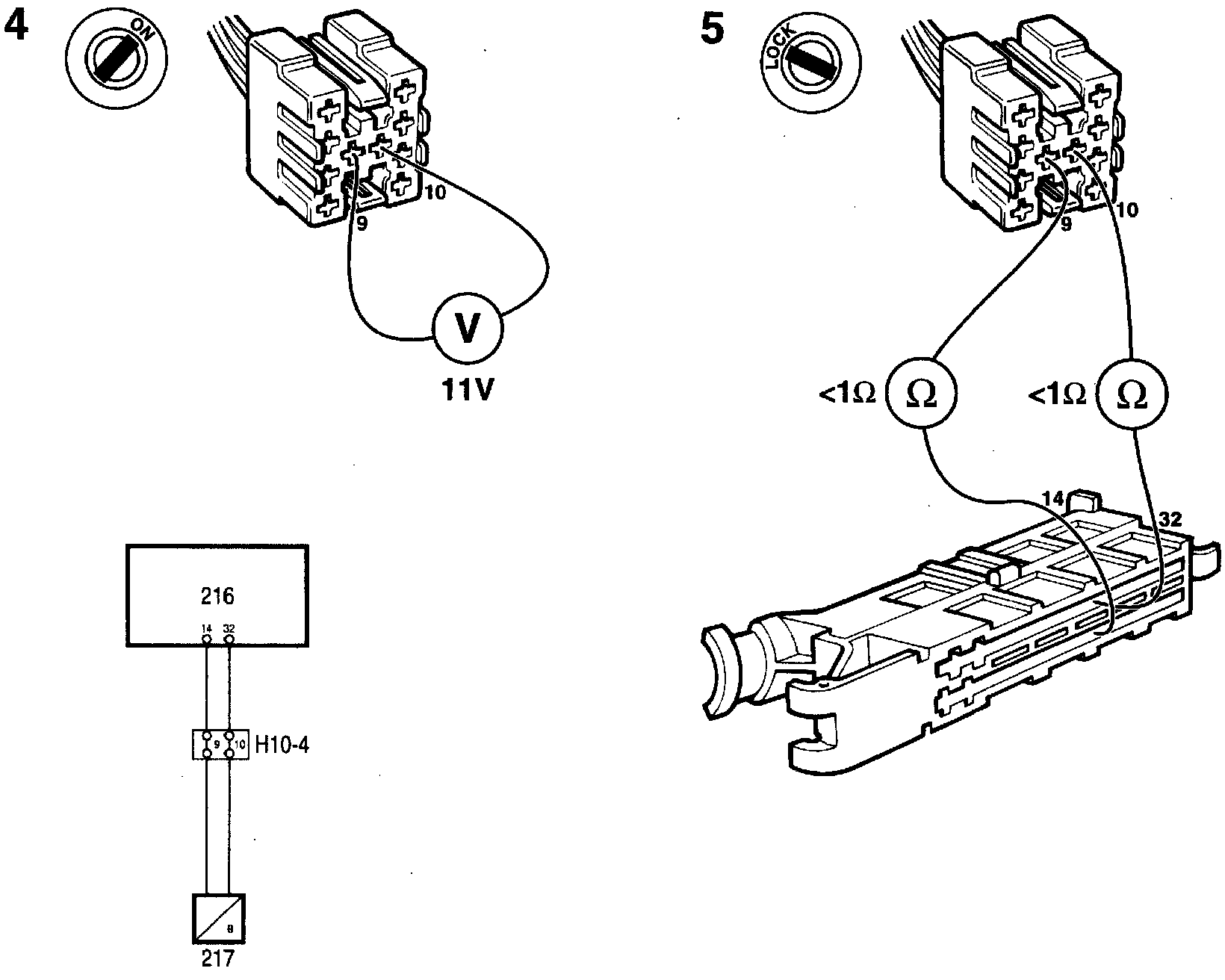 4 Measure the voltage between pins 9 and 10 in connector H10-4. The voltage should be about 11 V. If the value is correct, change the sensor.