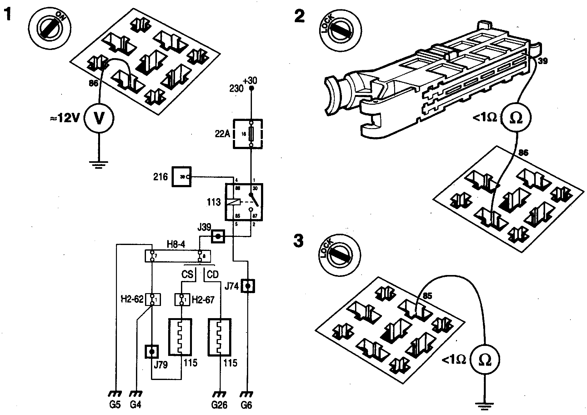 3 Check the lead between connector 5 (relay 85) and ground for open/short circuit to ground.