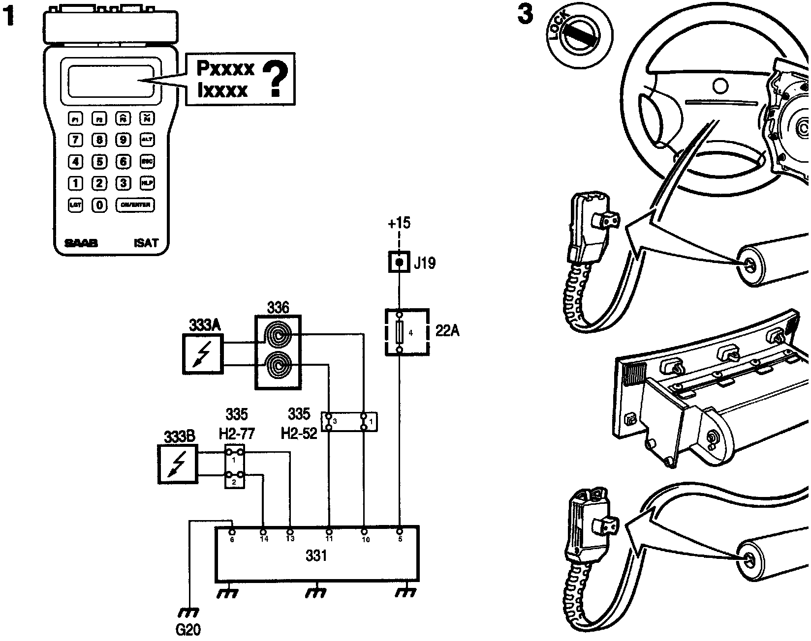 1. Connect ISAT. Note the diagnostic trouble code and the type of fault. P=permanent fault, 1= intermittent fault.