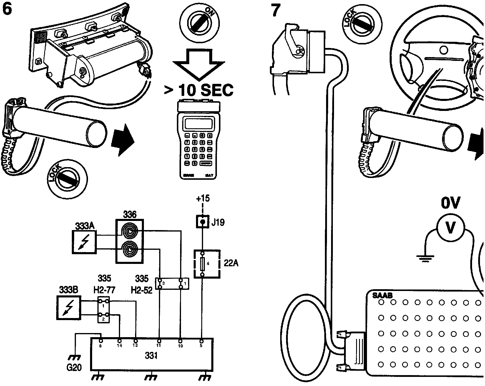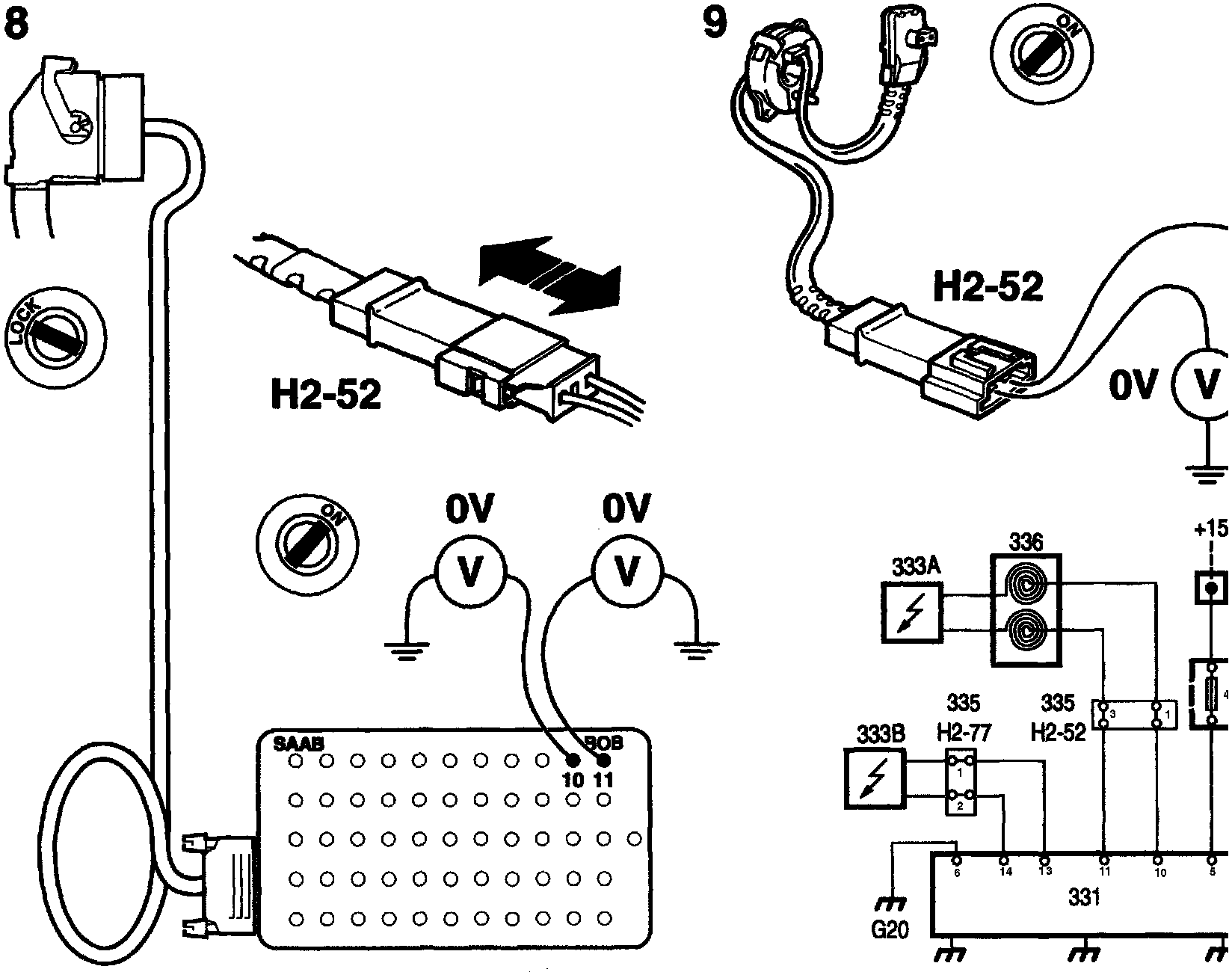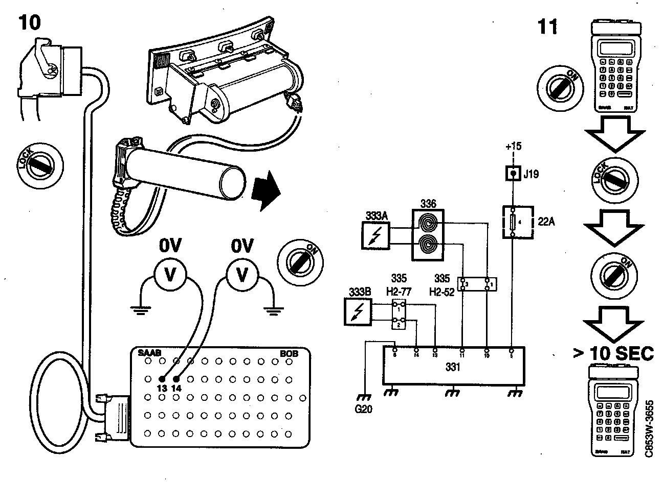 Switch on the ignition and connect a voltmeter between contact 10 on the BOB and a safe grounding point. Then connect the voltmeter between contact 11 and a safe grounding point.