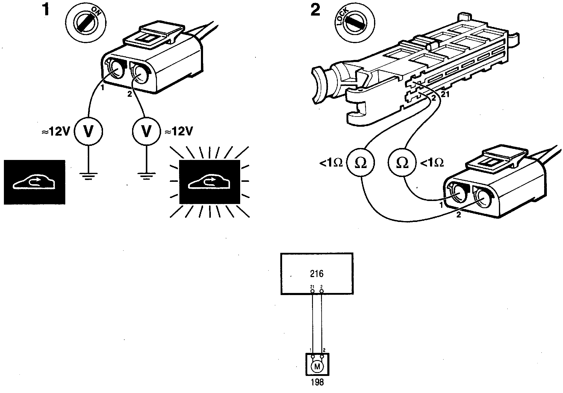 1 Unplug the recirculation motor's 2 pin connector. Measure voltage as follows: