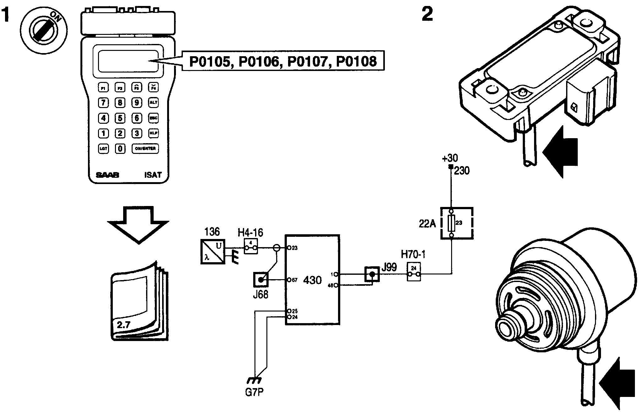 If diagnostic trouble codes P0105, P0106, P0107, P0108, manifold absolute pressure sensor, are present, fault diagnosis should be started there.