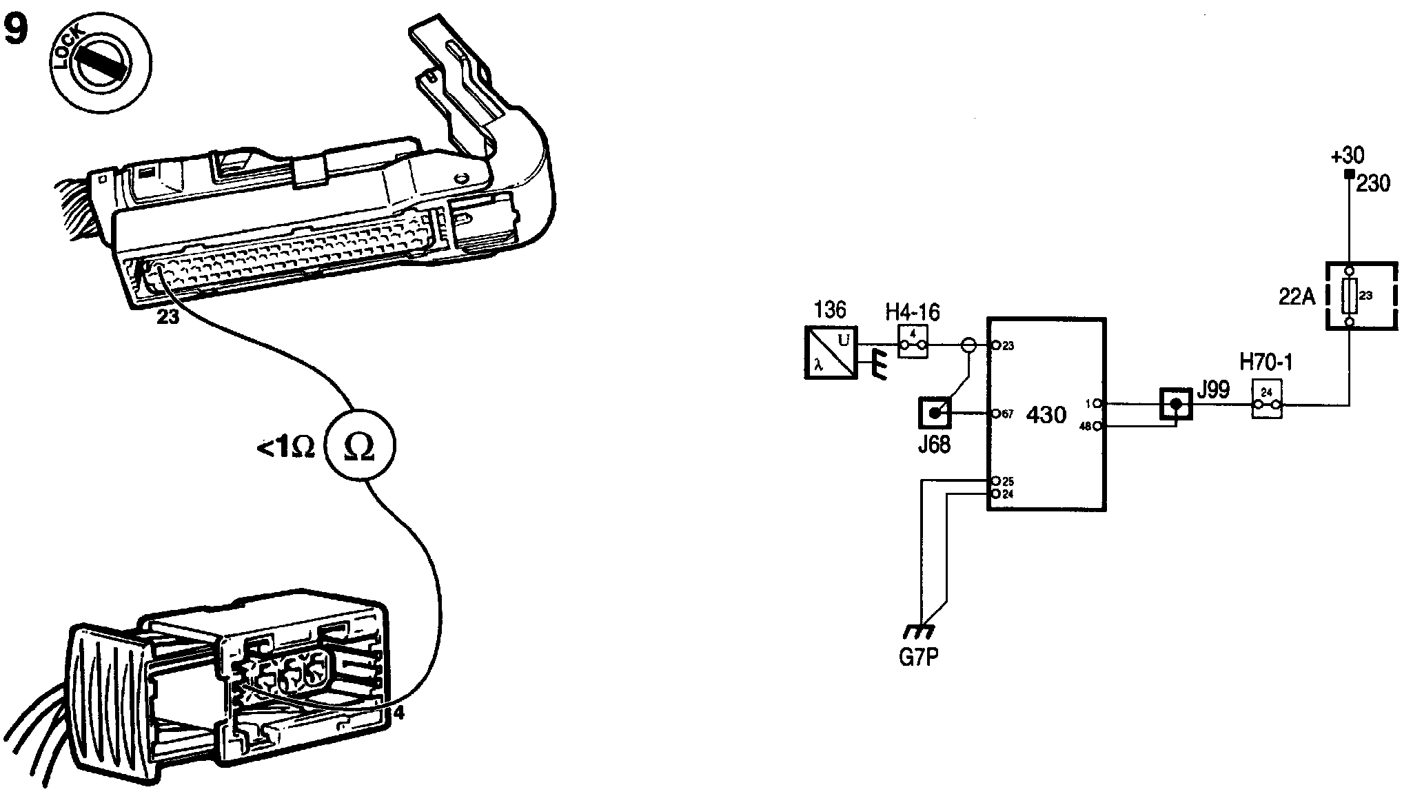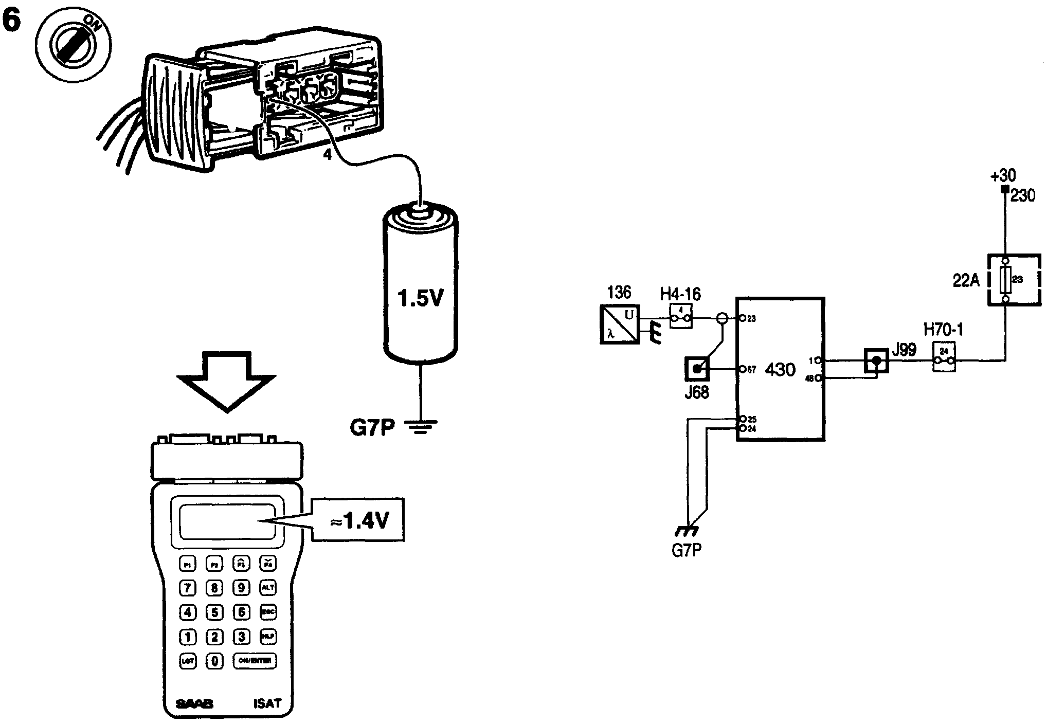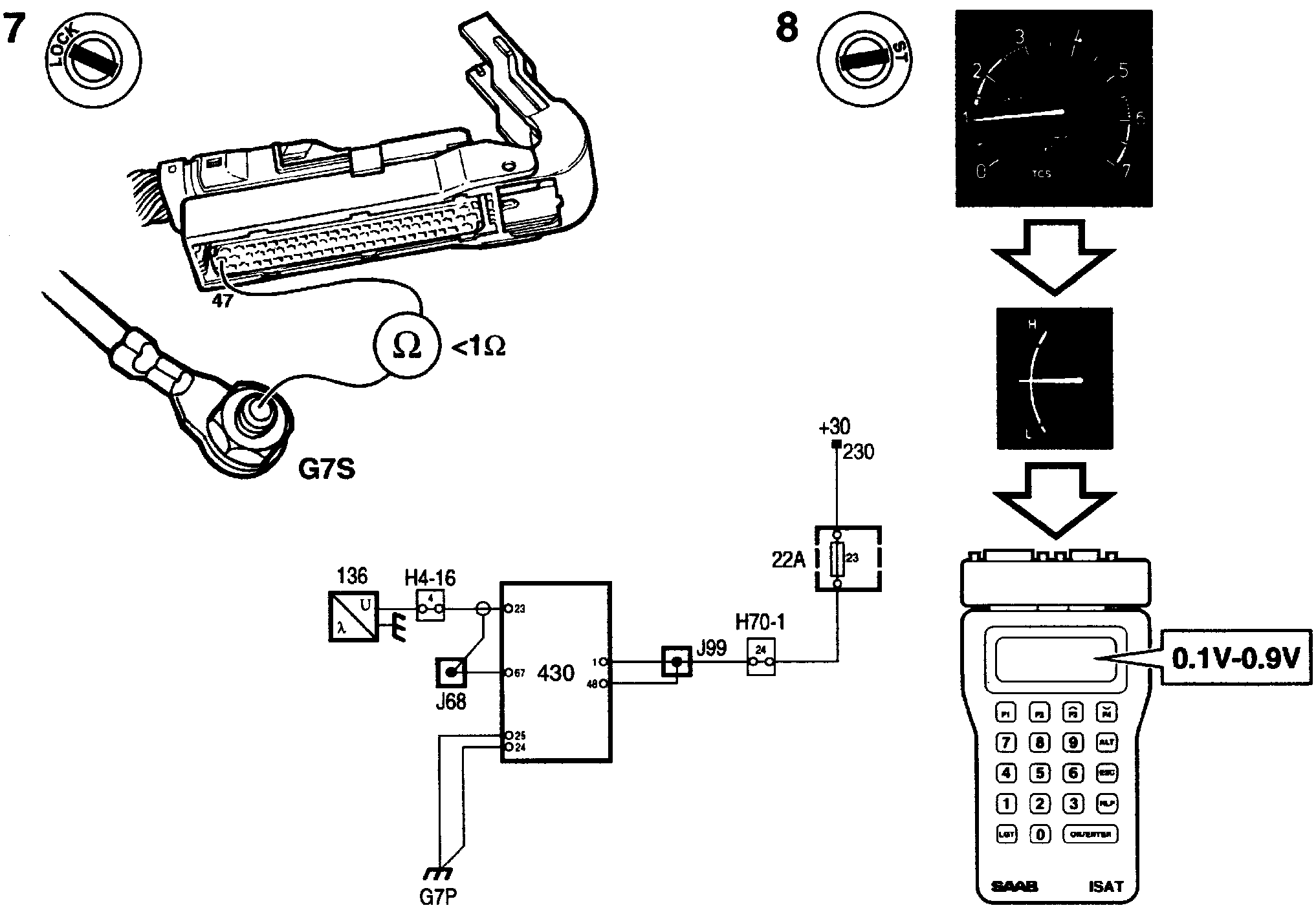 NOTE: In the event of a break in the oxygen sensor's reference ground between grounding point G7S and pin 47 of the control module, the Scan Tool will show a reading of about 0.5 V.