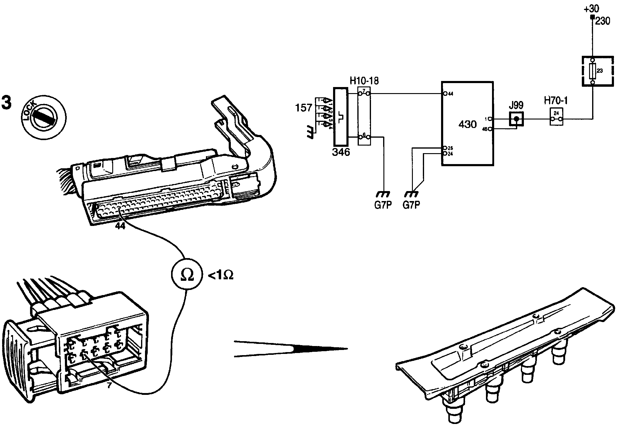 3. Checking the knocking signal wiring Check the lead between pin 7 of the ignition discharge module and pin 44 of the control module for continuity.