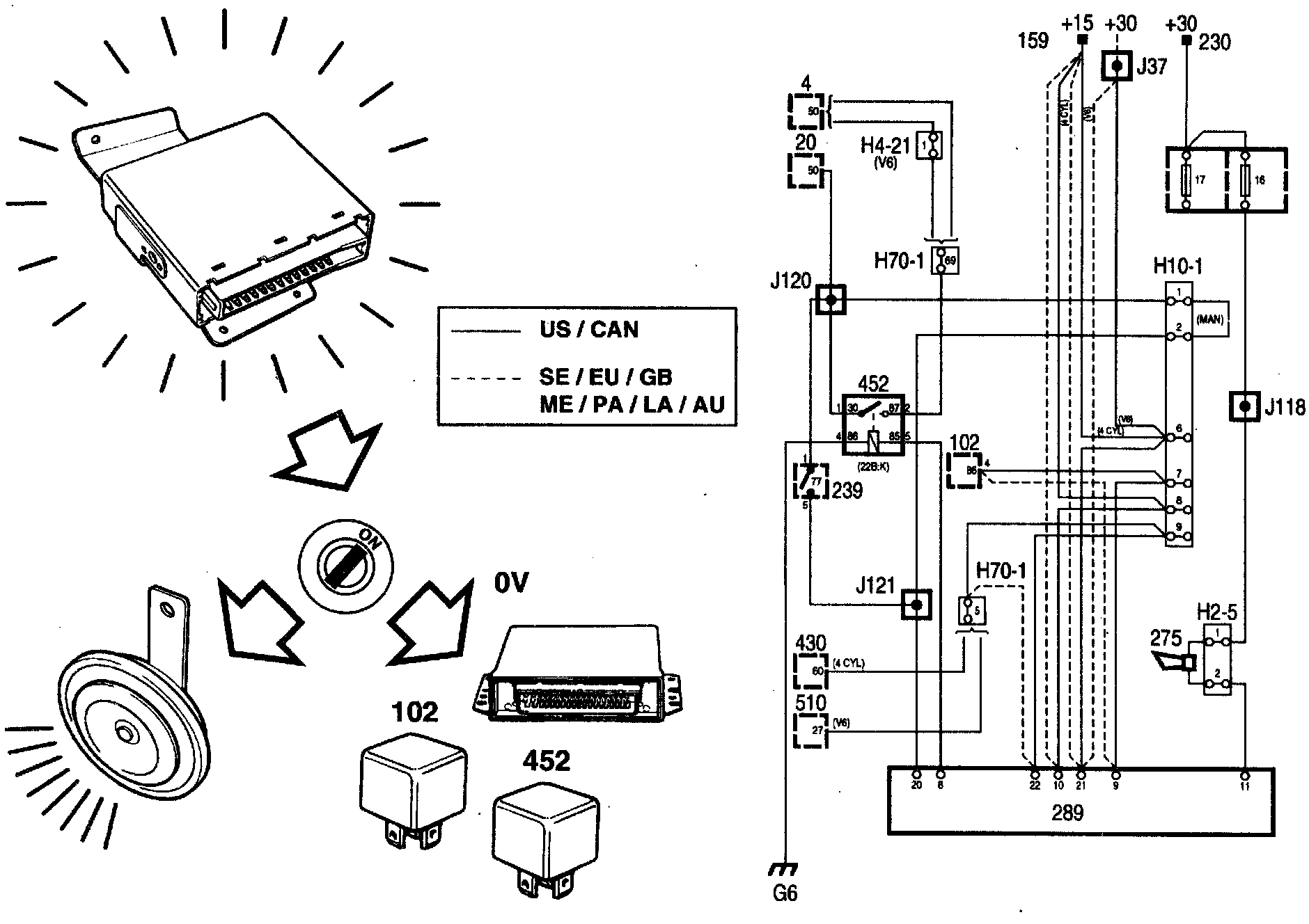 - Starter relay (ignition "ST" +50) does not receive operating voltage as the alarm control module (pin 8) breaks the voltage if a attempt is made to start the car.