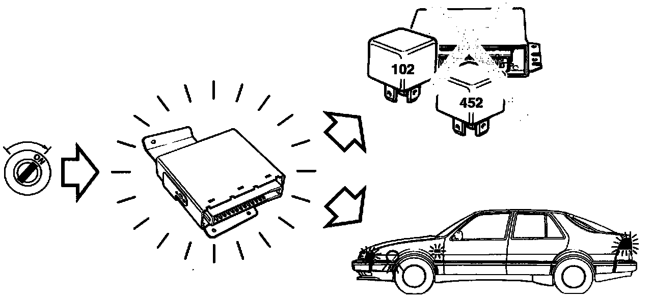 The ignition switch is connected to the control module (pin 10) so that the control module senses the voltage (+12 V) if the ignition is turned to the "ON" position (+15). The alarm is set off if the theft alarm is armed. This means that if an attempt is made to start the car, both the alarm and 3 circuit breaking (blocking of operating voltage to the starter and fuel pump relays and +15 to the engine control module) are set off.