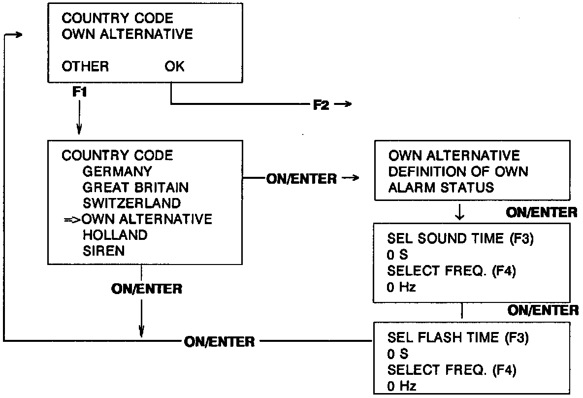 The theft alarm is pre-programmed for the requirements of 4 different countries on how an alarm is given. The operation thus fulfills the laws and insurance requirements that apply in these countries. For countries with other requirements, and for different customer requirements, individual programming is available under "OWN ALTERNATIVE" in the menu.