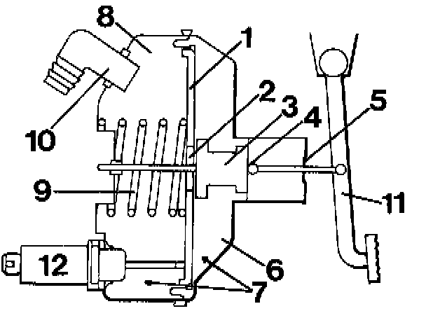 The servo unit reinforces the driver's pedal effort when the brakes are applied. The reinforcement of the force applied which is achieved through the servo unit is obtained from the vacuum in the engine intake manifold, and amounts to around 4:1. The servo unit is connected to the intake manifold by a hose.