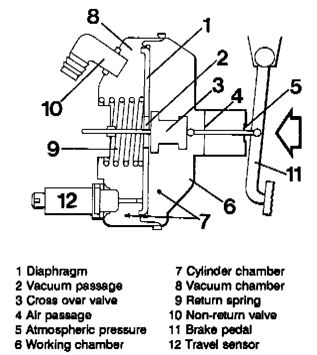 In the rest position (brakes off), the air passage (4) is closed and the vacuum chamber (8) is connected to the working chamber (6) via the open cross over valve (3). Equal vacuum exists on both sides of the diaphragm (1) in the brakes off position.