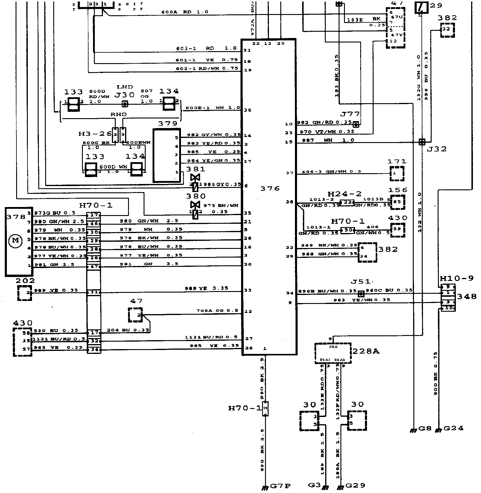 159 Distribution terminal (+15 circuit) in main fuse box behind the glove box.