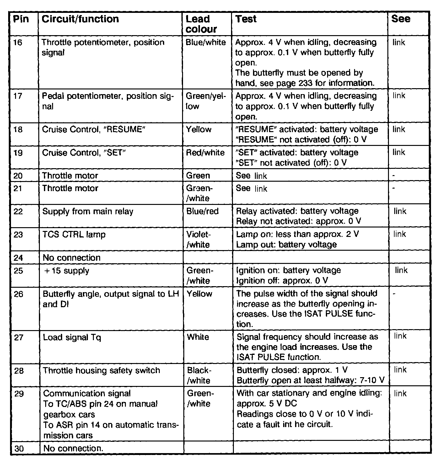 The following contain values and instructions for measuring voltage levels on the ASR control unit. This table naturally only covers cars with an automatic transmission.