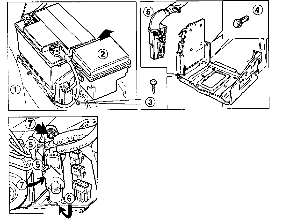 3. Disconnect the battery tray by unscrewing the four screws (3) and the four bolts (4).