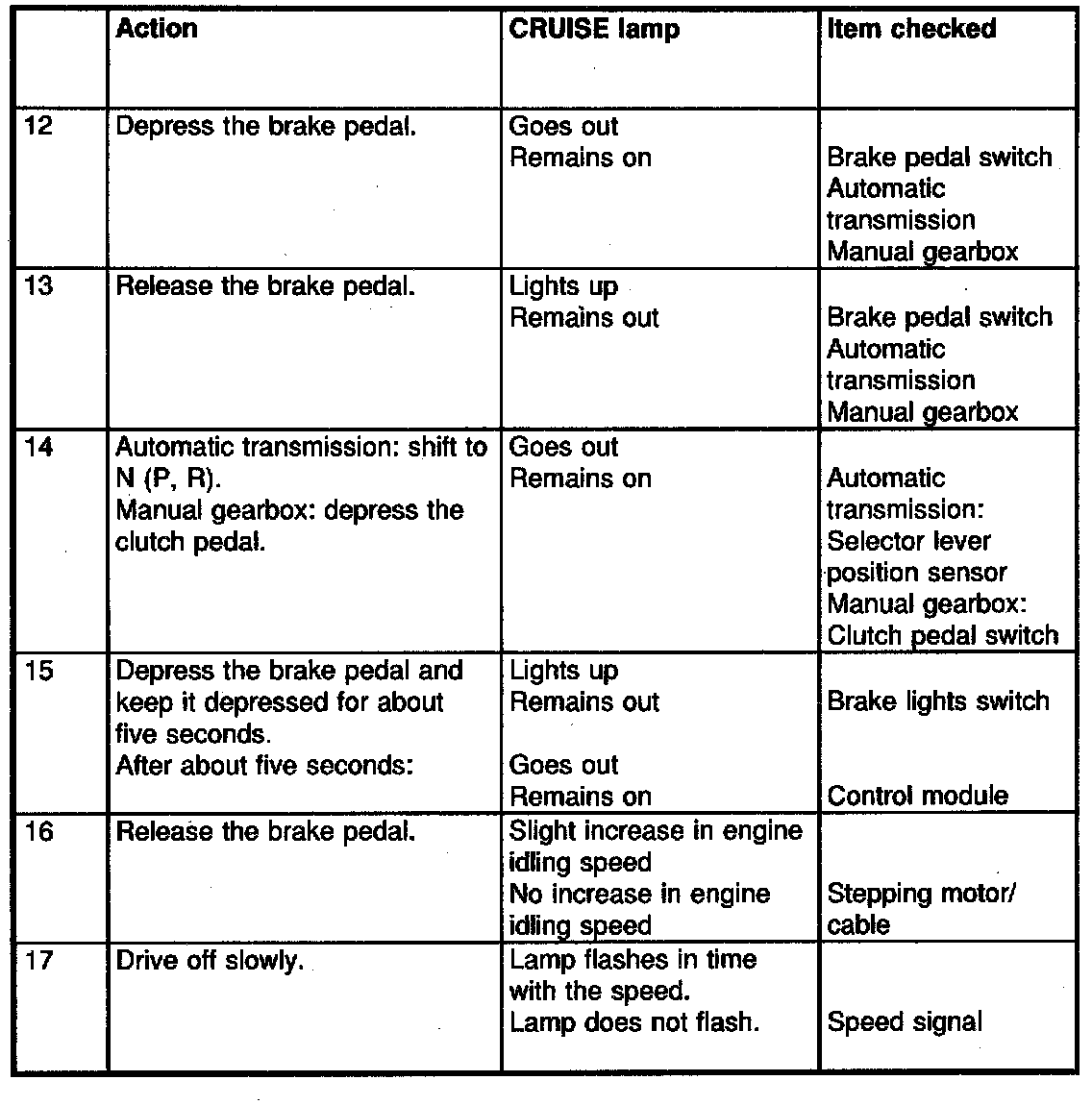 When carrying out fault diagnosis, use is made of the Cruise Control system's switches as well as the clutch and brake pedals. On cars with automatic transmission, use is made of the Cruise Control system's switches, the brake pedal and selector lever.