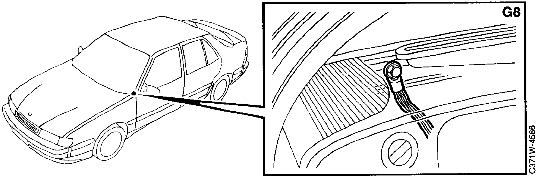 Grounding point G8 is located behind the dashboard under the left-hand speaker grille on the stiffening member. The following components are connected: