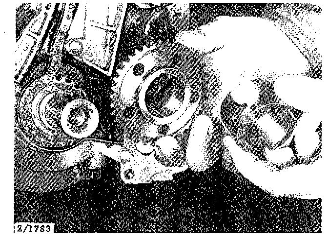 14. Install the balance-shaft chain and idler-wheel sprocket, ensuring that the timing marks on the bearing housing and sprocket are in line. On installation, leave some slack in the chain in line with the tensioner, and keep the chain reasonably taut by means of the top chain guide.