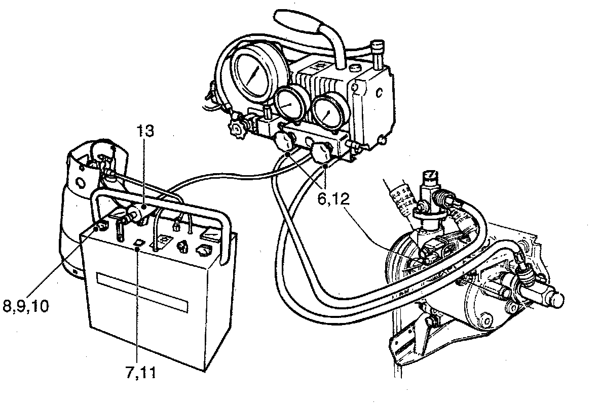 NOTE: Vacuum pumping should be carried out on both the low-pressure and high-pressure sides at the same time. A non-return valve in the intake to the low-pressure side of the compressor makes it impossible to vacuum pump one side only.