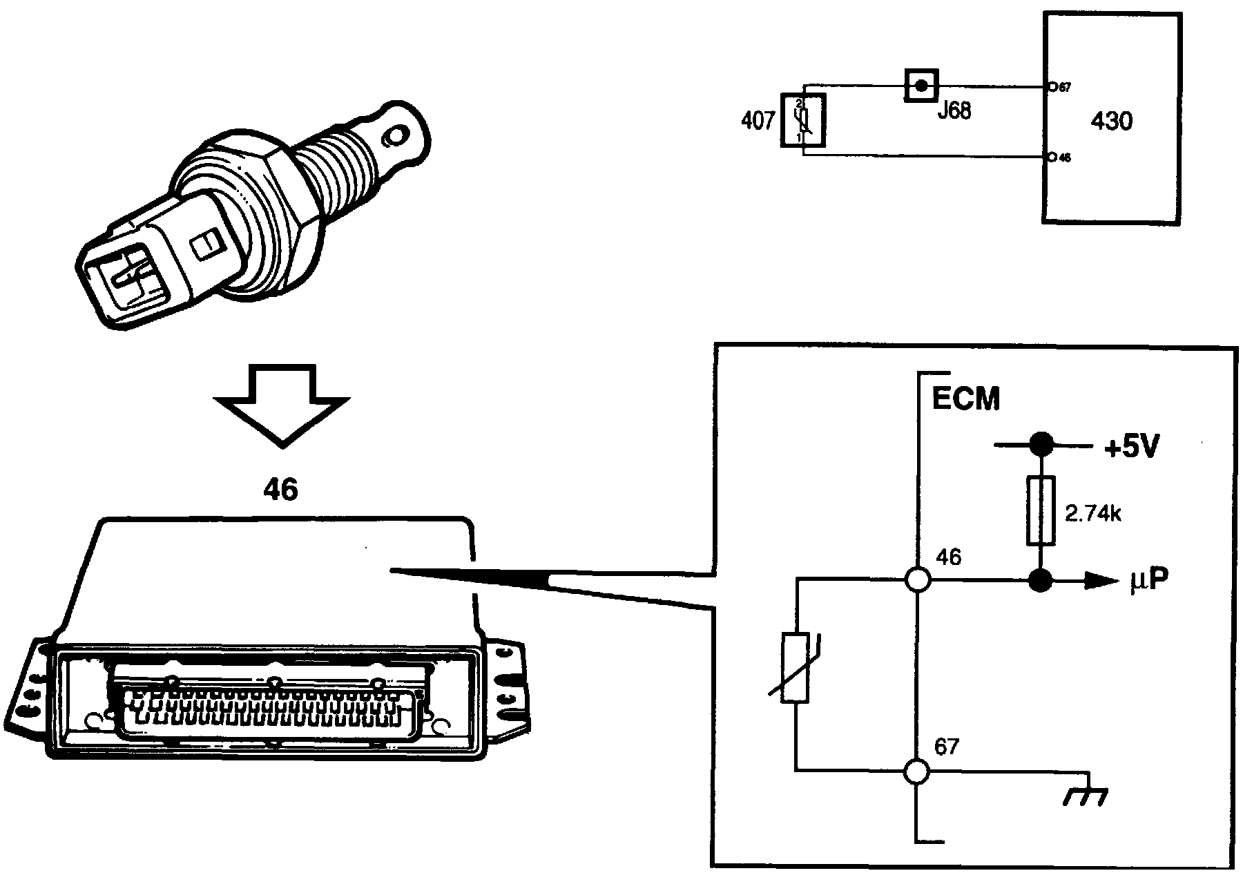 PRINCIPLE OF OPERATION, INTAKE AIR TEMPERATURE SENSORIntake Air Temperature Sensor--is of NTC type and located in the intake manifold before the throttle. The control module measures the air temperature in the intake manifold by applying 5 V to the sensor from pin 46 via a built-in 2.74k ohms resistor. The sensor is grounded via pin 67, The voltage across the resistor in the control module is proportional to the intake air temperature.