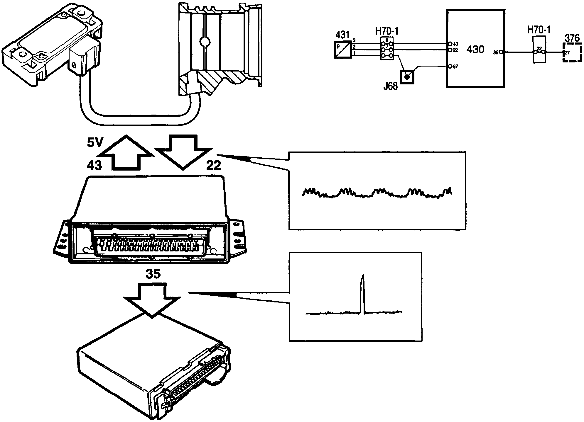 The control module uses intake manifold pressure and temperature to calculate the engine load, i.e. how much air mass is sucked in by each cylinder. Fuel injection duration is proportional to the air mass sucked in by the cylinders. At barometric pressure (100 kPa), the voltage from the pressure sensor is about 1.9 V. Information from the pressure sensor is also used for calculating ignition timing and controlling boost pressure.