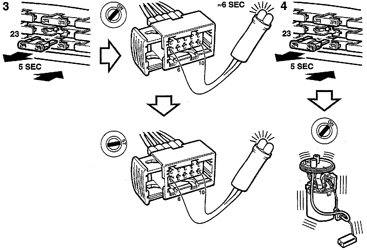 - Ignition switch in the ON position - listen for the sound of the fuel pump working. It should run for about 2 seconds. If it does not, see fault diagnosis, fuel pump relay/fuel pump. Fuel Pump Relay / Fuel Pump