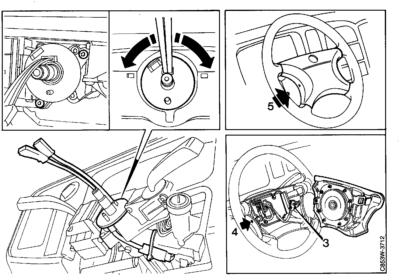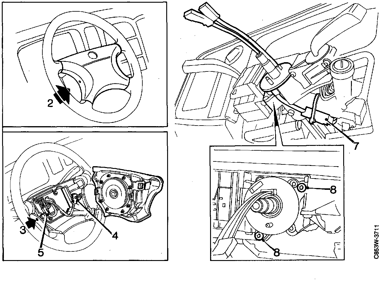 Fit the upper steering column cover and then the lower one (4 screws). Make sure that the leads to the contact roller are not pinched by the cover's center retaining screw.