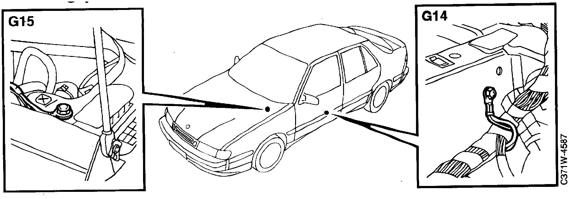 Grounding point G14 is located in the left-hand seat member under the carpet on the left-hand side. The following components are connected: