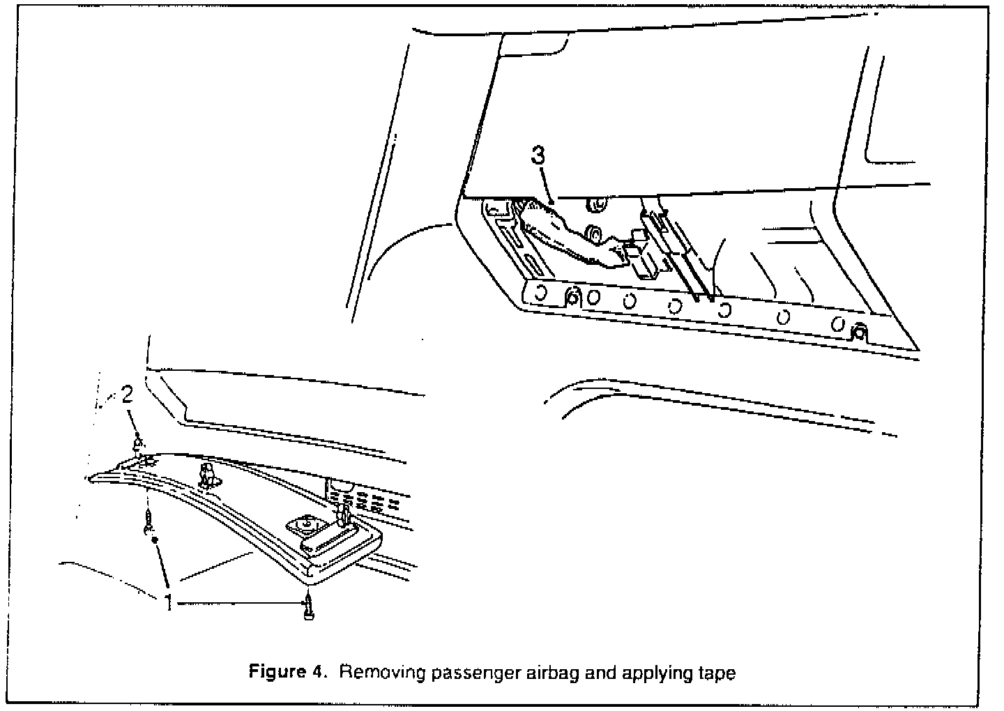 2. Remove the airbag unit cover on the passenger side taking care not to damage the clips. See Figure 4, item 2. You can obtain special Airbag removal tool, P/N 82 92 997 from Kent-Moore. Use of this tool facilitates removal of the airbag cover.