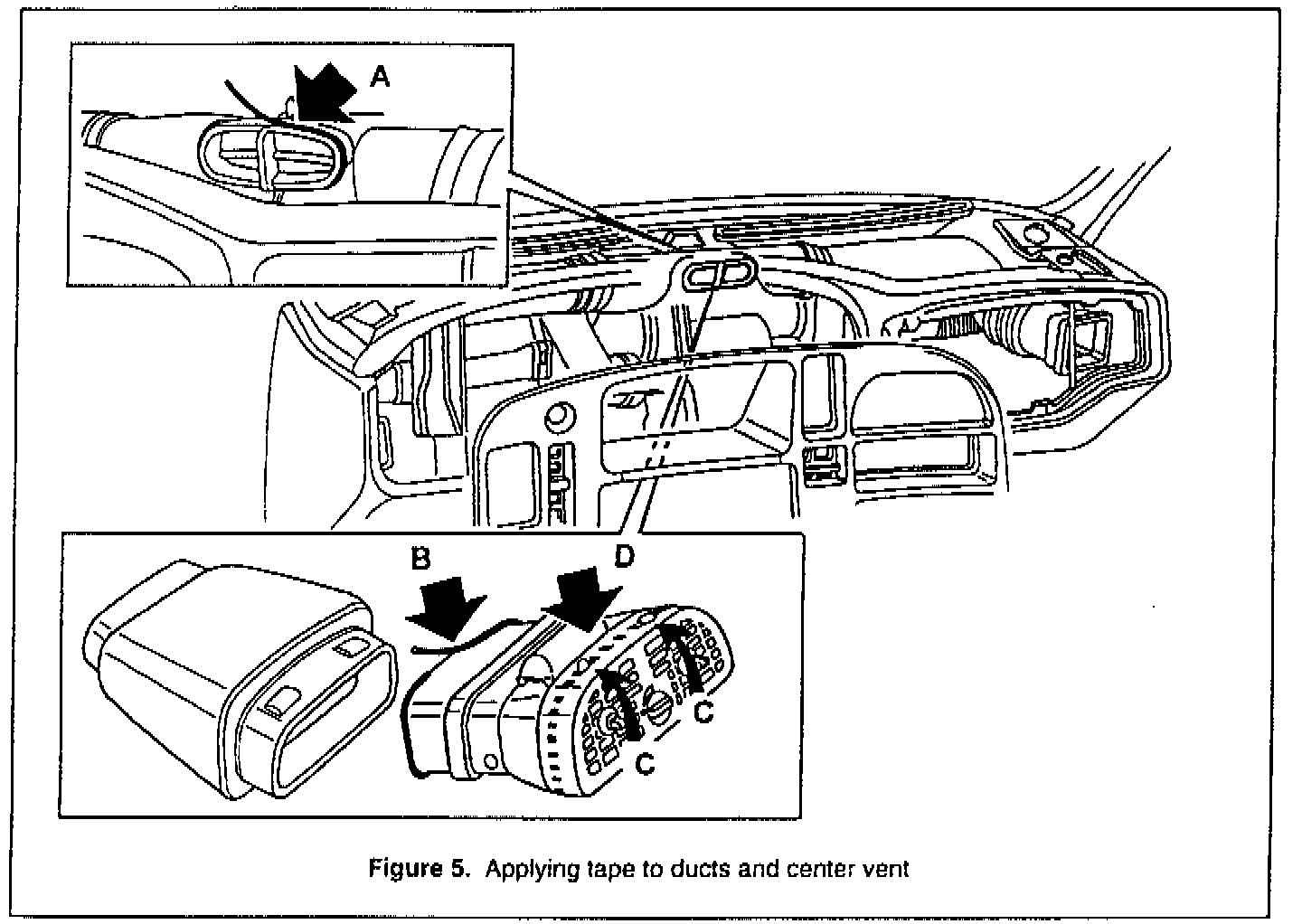 9. Press down the catches (Figure 4, item C) securing the vent to the duct. Bend up the edge slightly and apply butyl tape under the joint at D as shown in Figure 5.