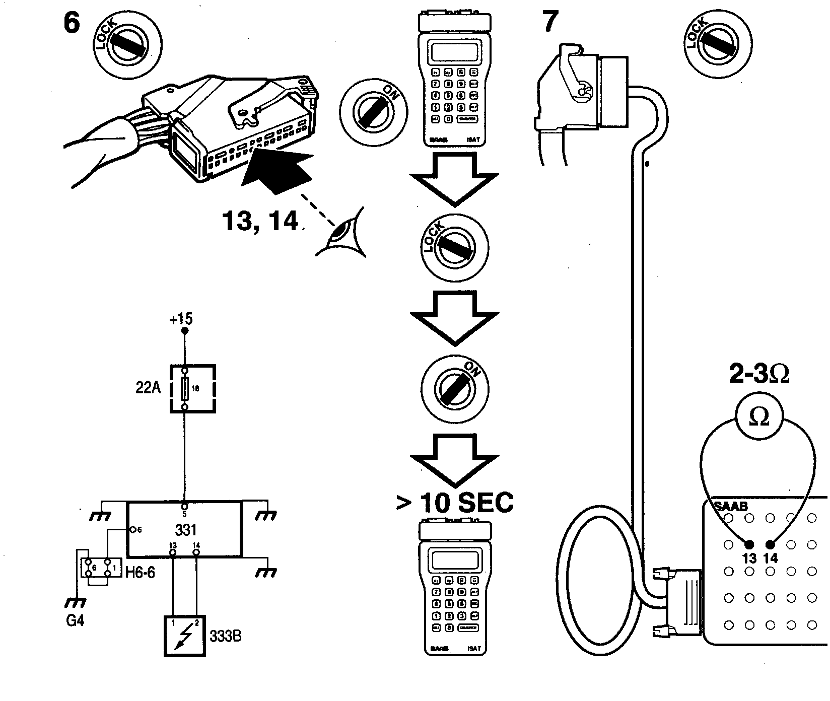 7. Switch off the ignition Unplug the connector from the SRS control module and connect a BOB. Connect an ohmmeter between contacts 13 and 14 on the BOB.