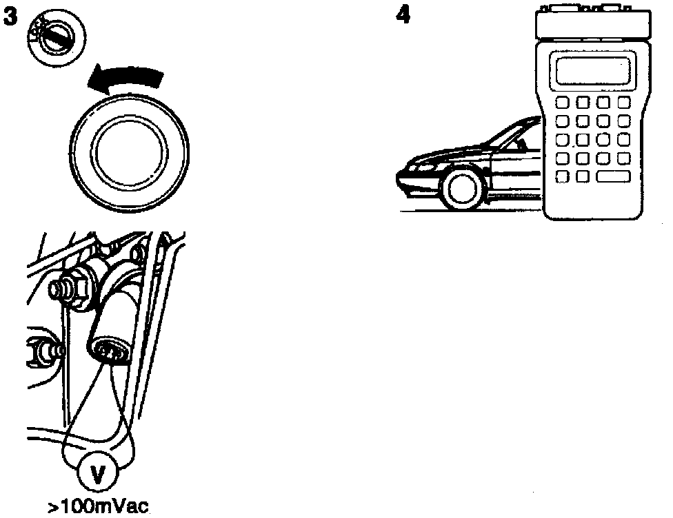 - Take a voltage reading, mVac, at the wheel sensor connector. Connect a voltmeter between the connector pins. Rotate the rear right wheel at approx. 1 turn per second. The wheel sensor voltage should be 100 mVac.
