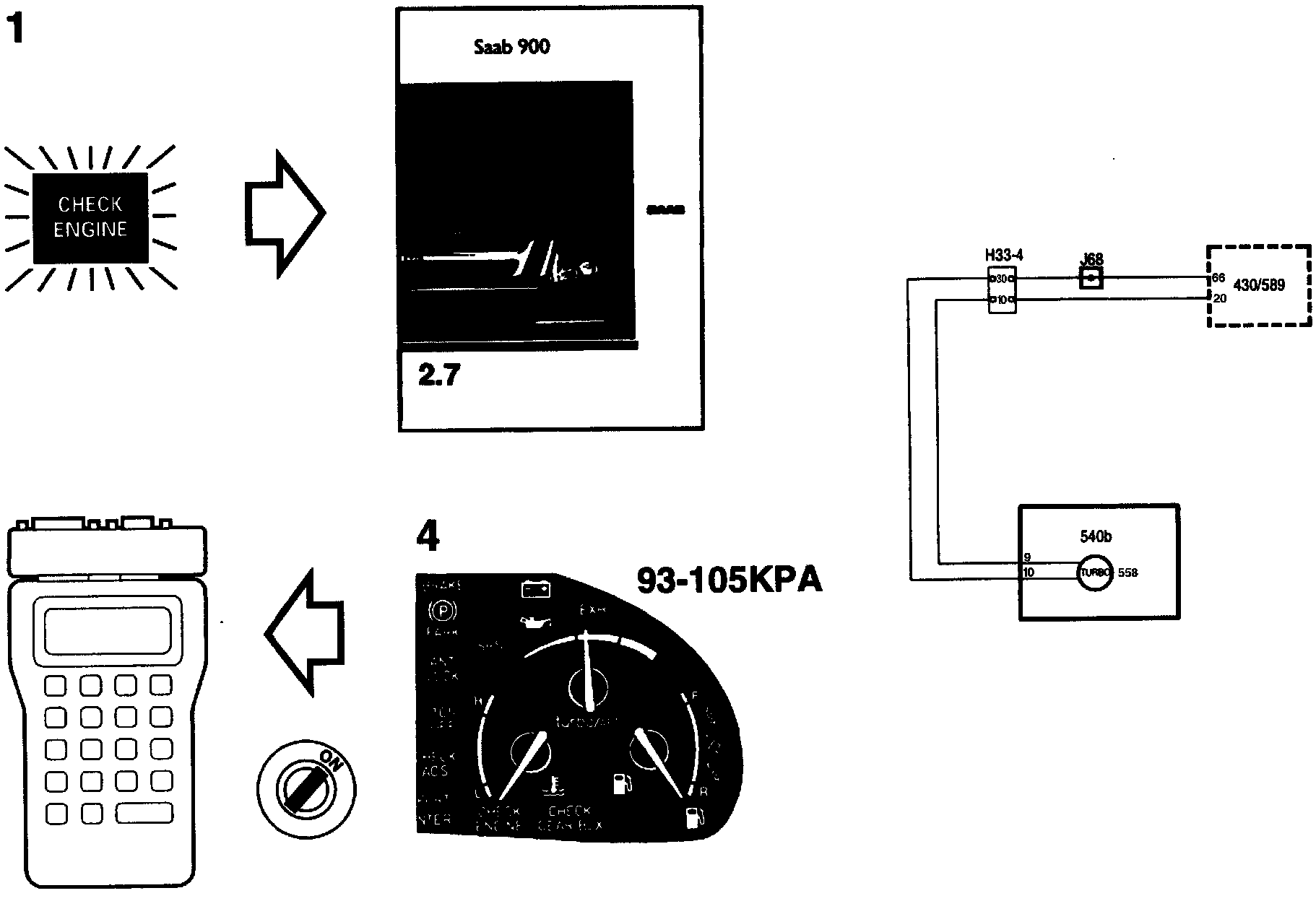 If the turbo pressure signal between the pressure sensor and the engine management system is faulty, the CHECK ENGINE lamp (MIL) will light up.