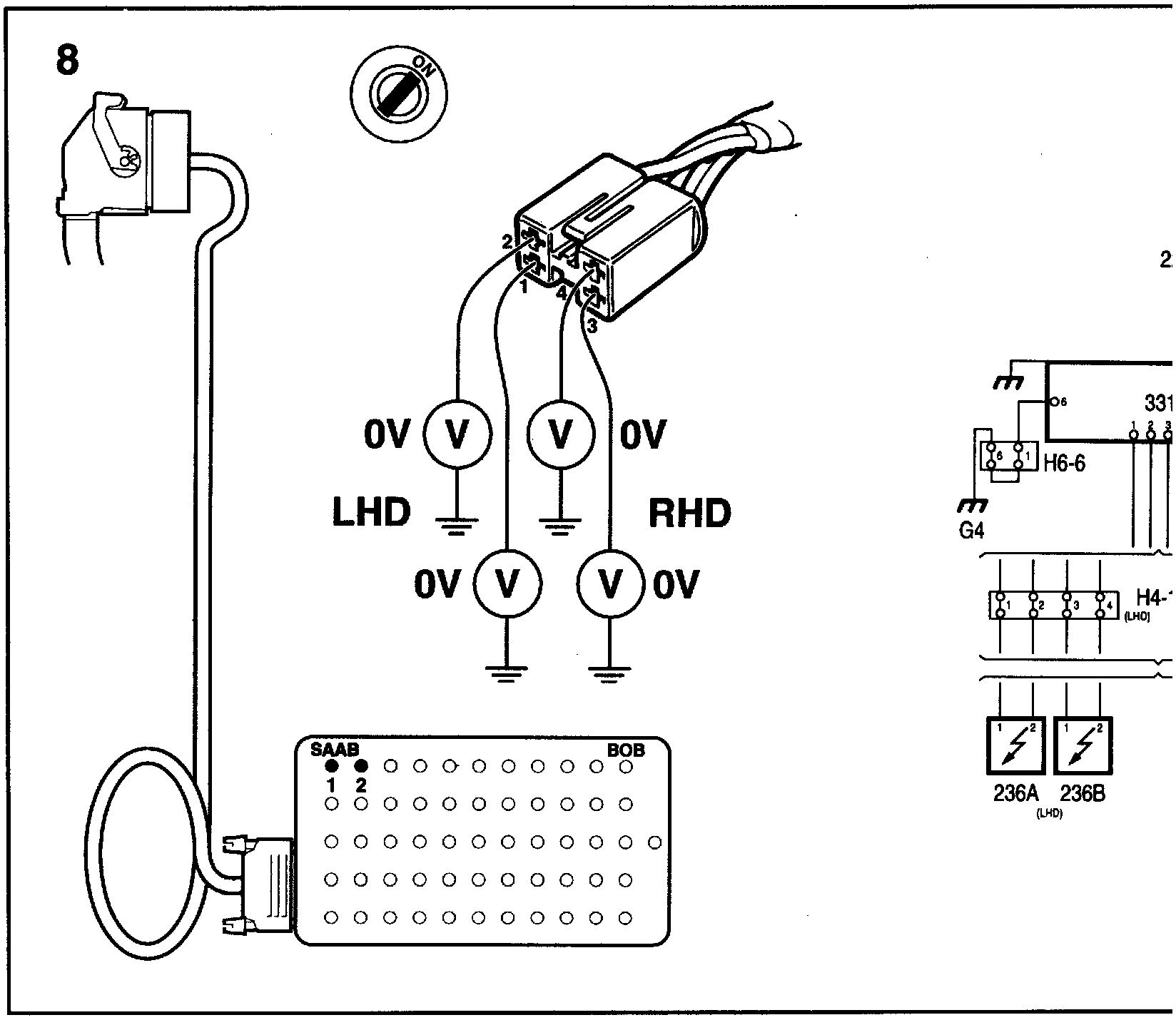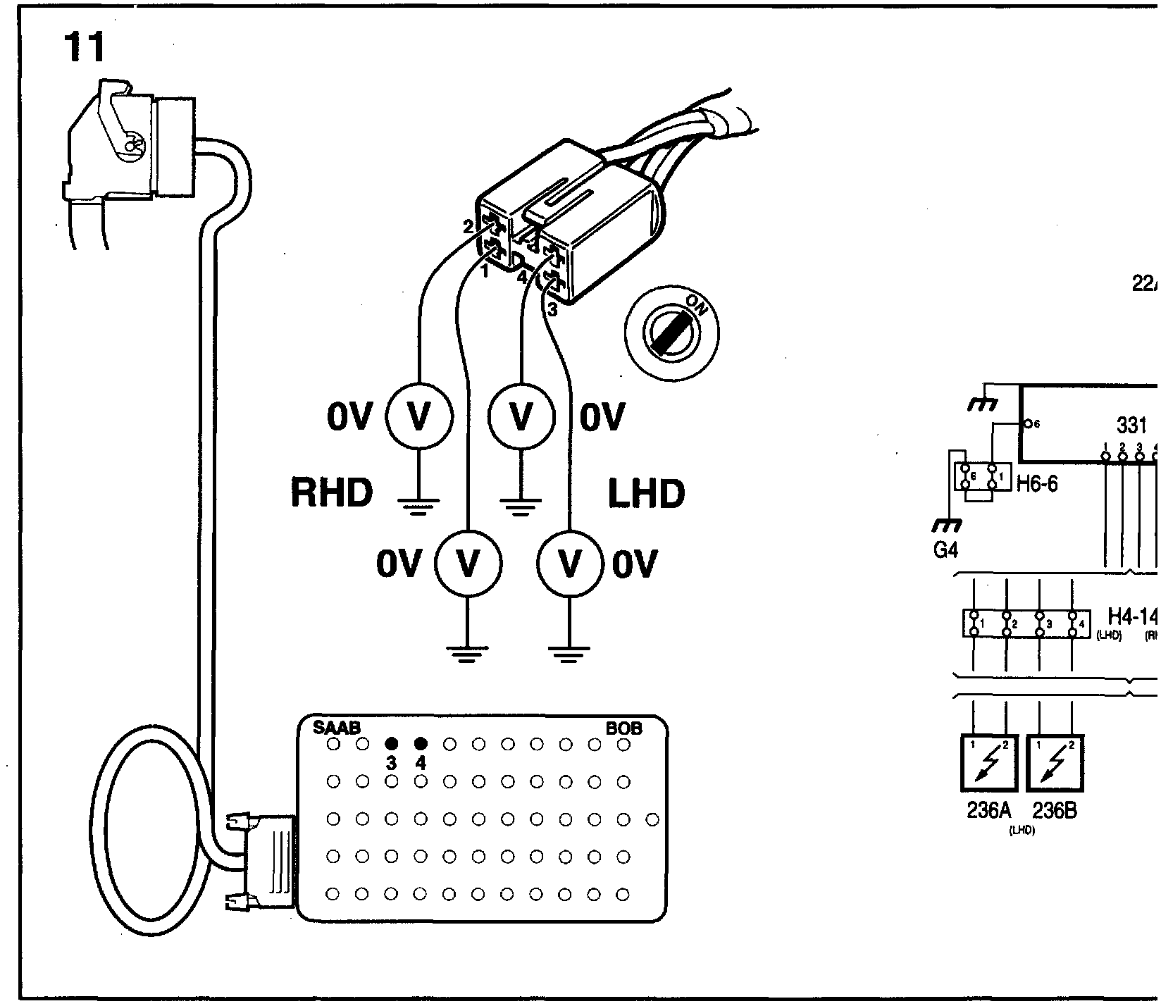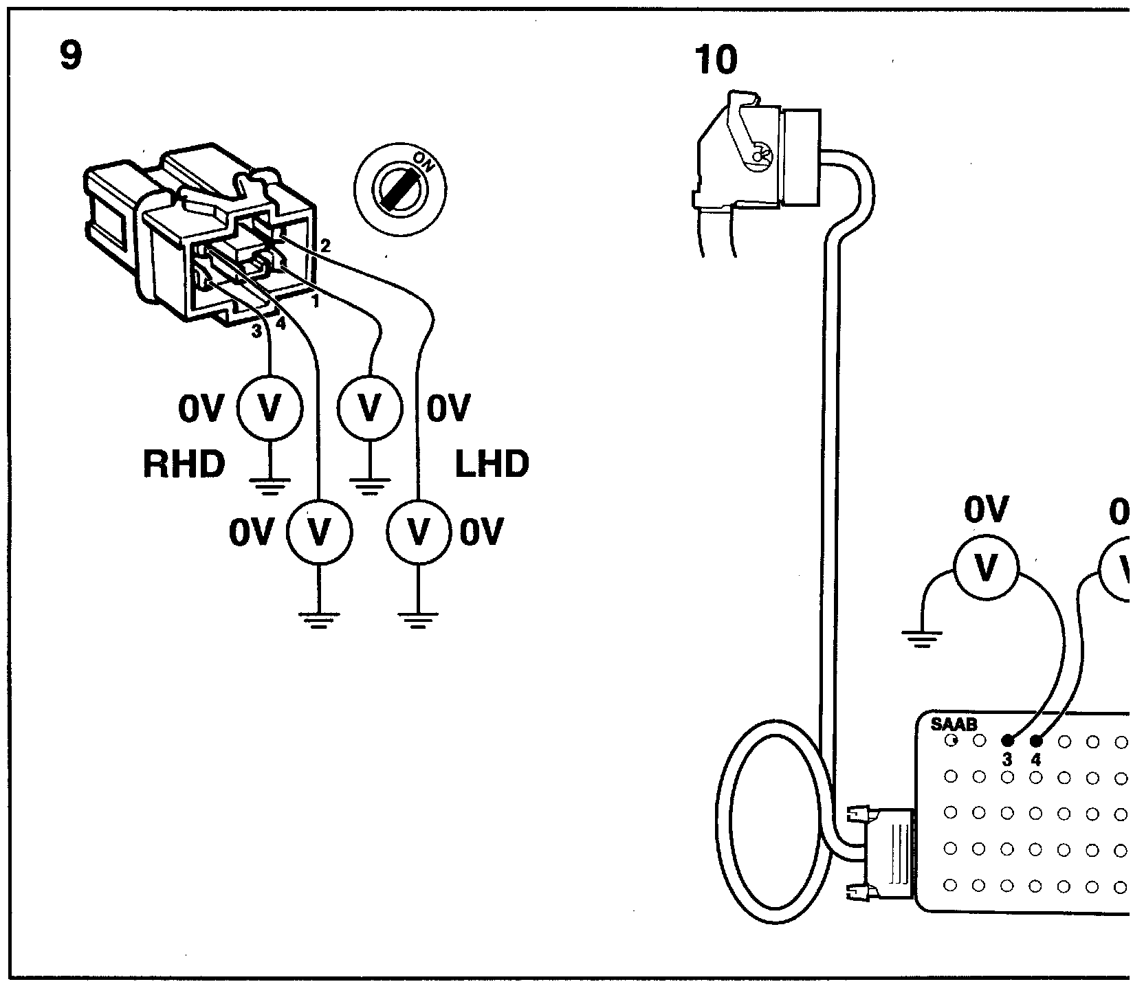 10. Test the passenger side belt tensioner: Connect the voltmeter between contact 3 on the BOB and a safe grounding point. Then connect the voltmeter between contact 4 on the BOB and a safe grounding point.