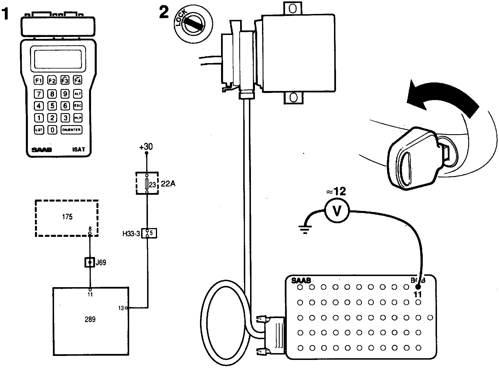 1 Connect the Intelligent Saab Tester (ISAT) and from the menu select "OBTAIN READOUTS" and then "UNLOCK SIGNAL".