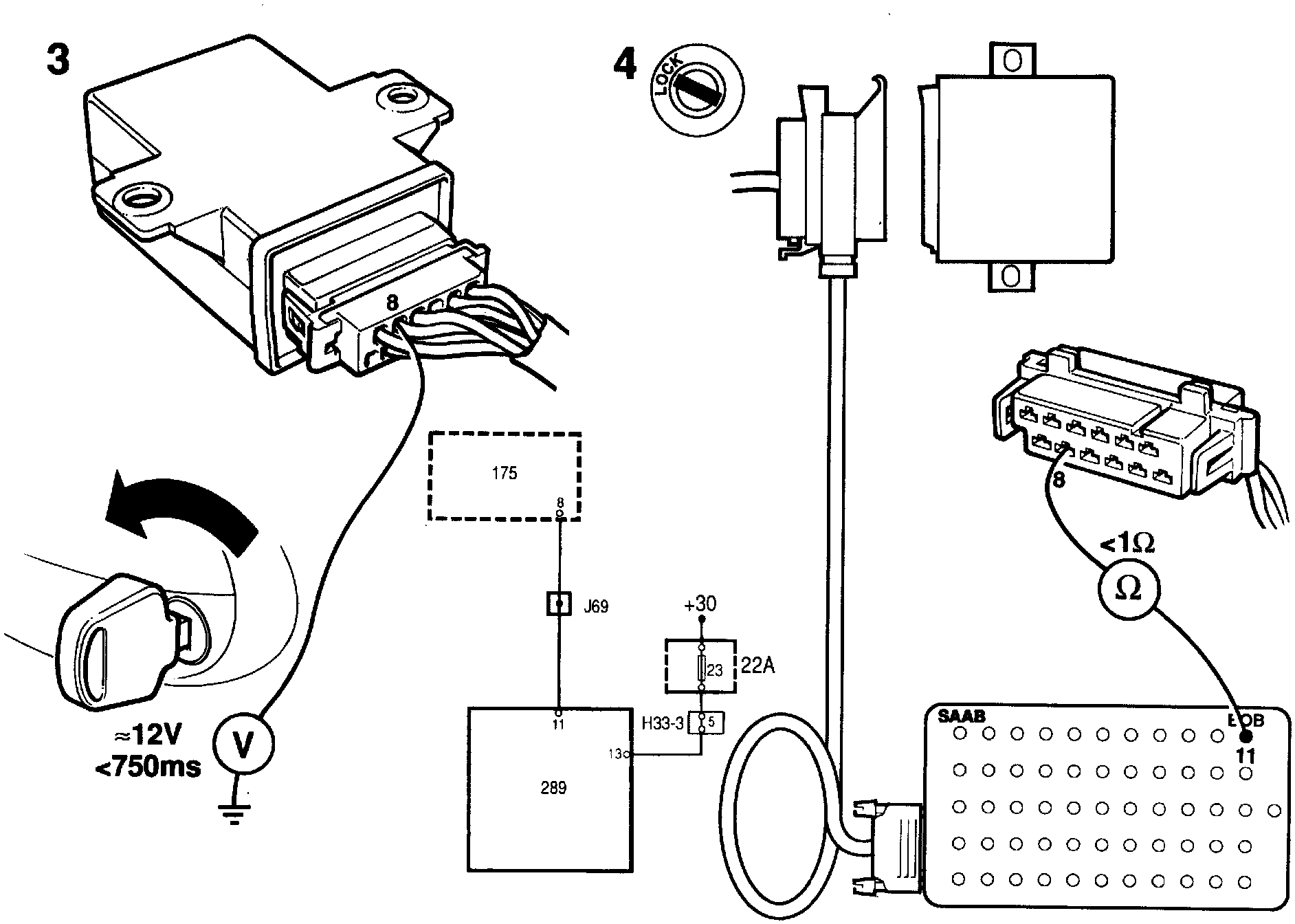 A reading of about 12 V should be obtained for about 750 ms.