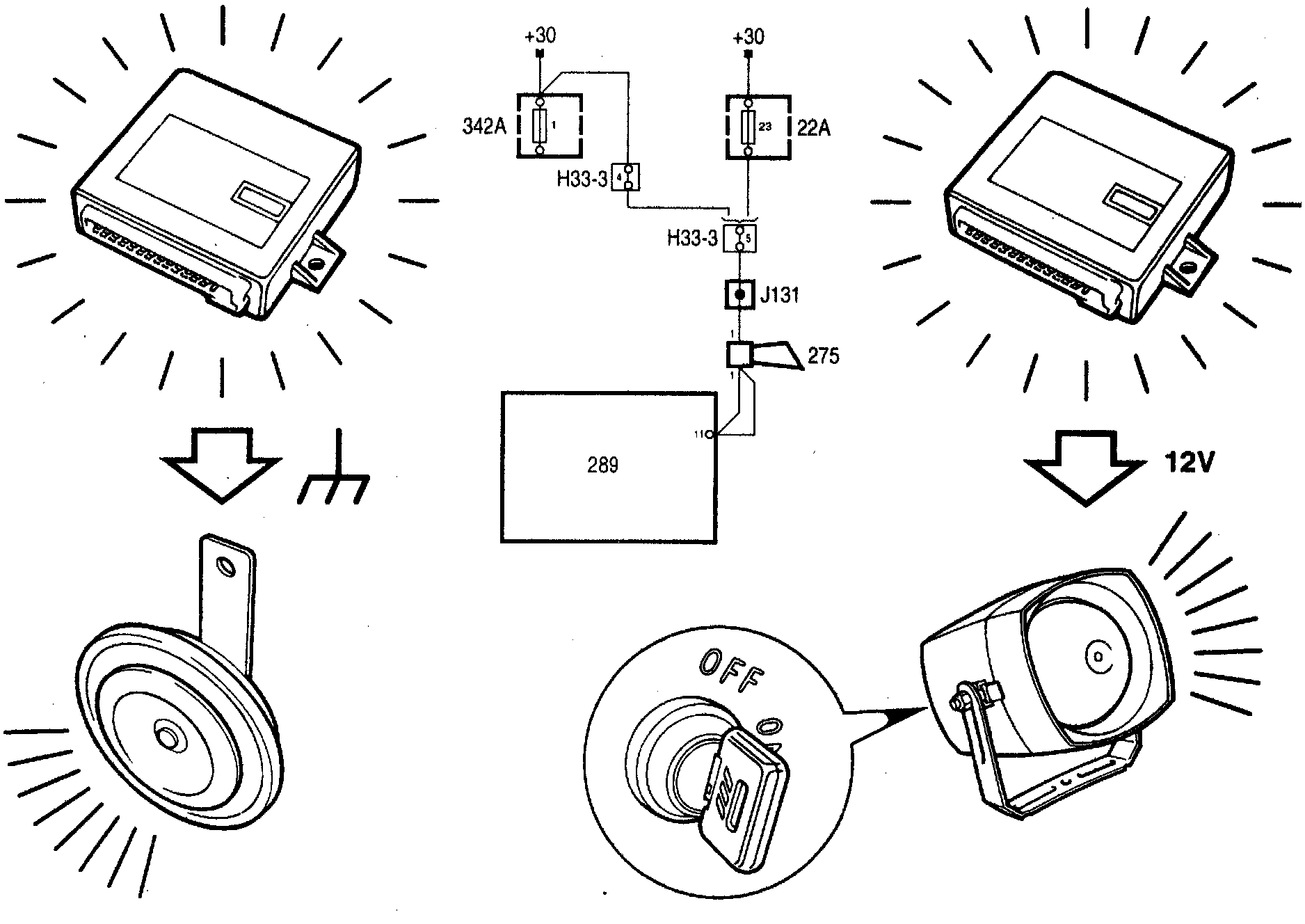 + 30 is connected to the horn. If the alarm is set off, the horn sounds by being grounded via the theft alarm control module (pin 11)-