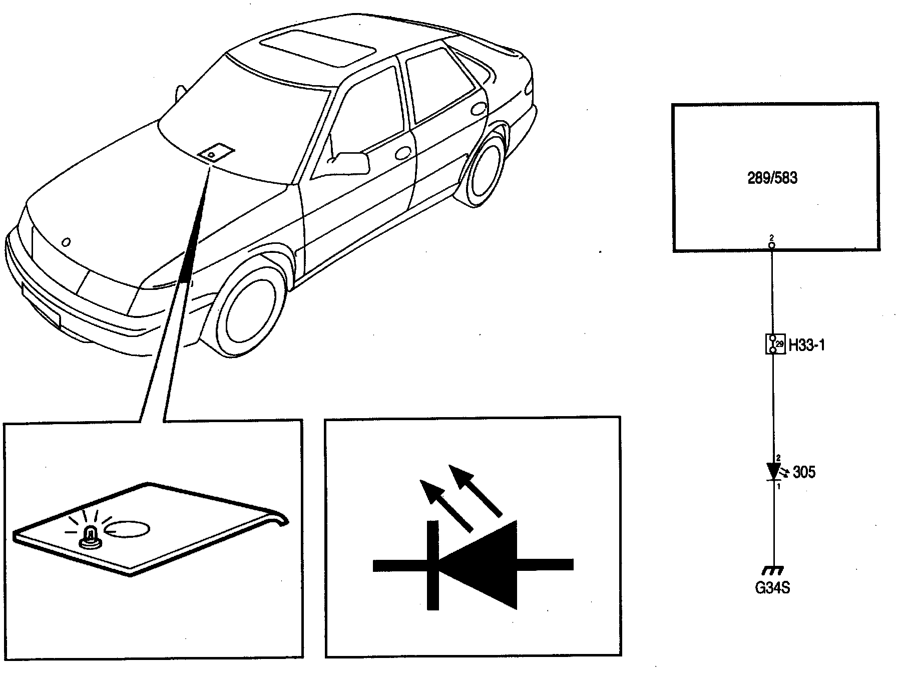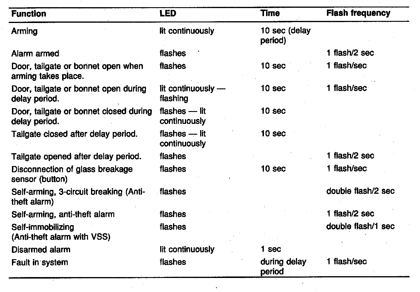 As a test function for the theft alarm, there is an LED mounted in the dashboard. This is controlled by the control module (pin 2) and flashes (with varying frequency) or lights continuously depending on the different conditions. Some normal cases are shown on the table below.
