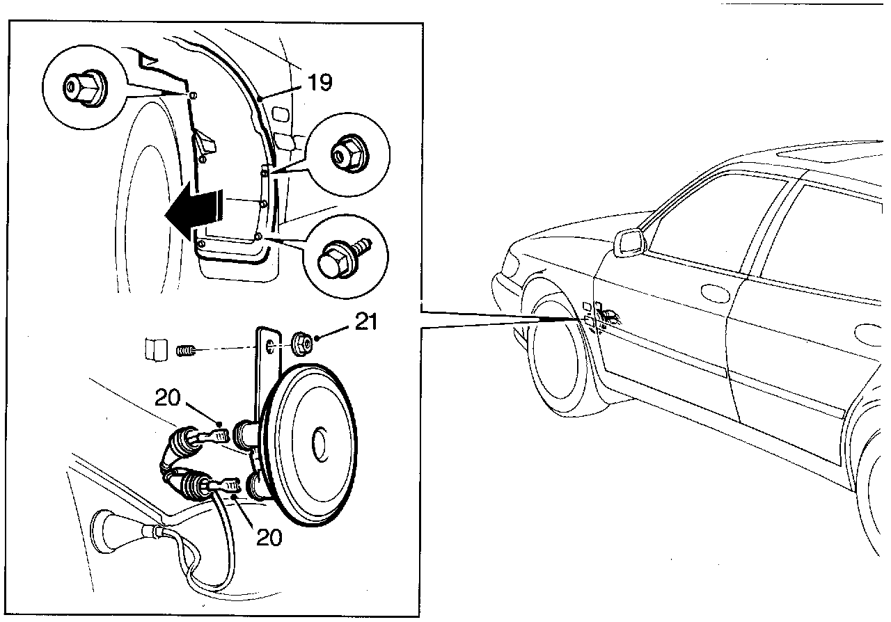 20 Find two 1 pin connectors in the wheel housing. Plug in the connectors to the horn.