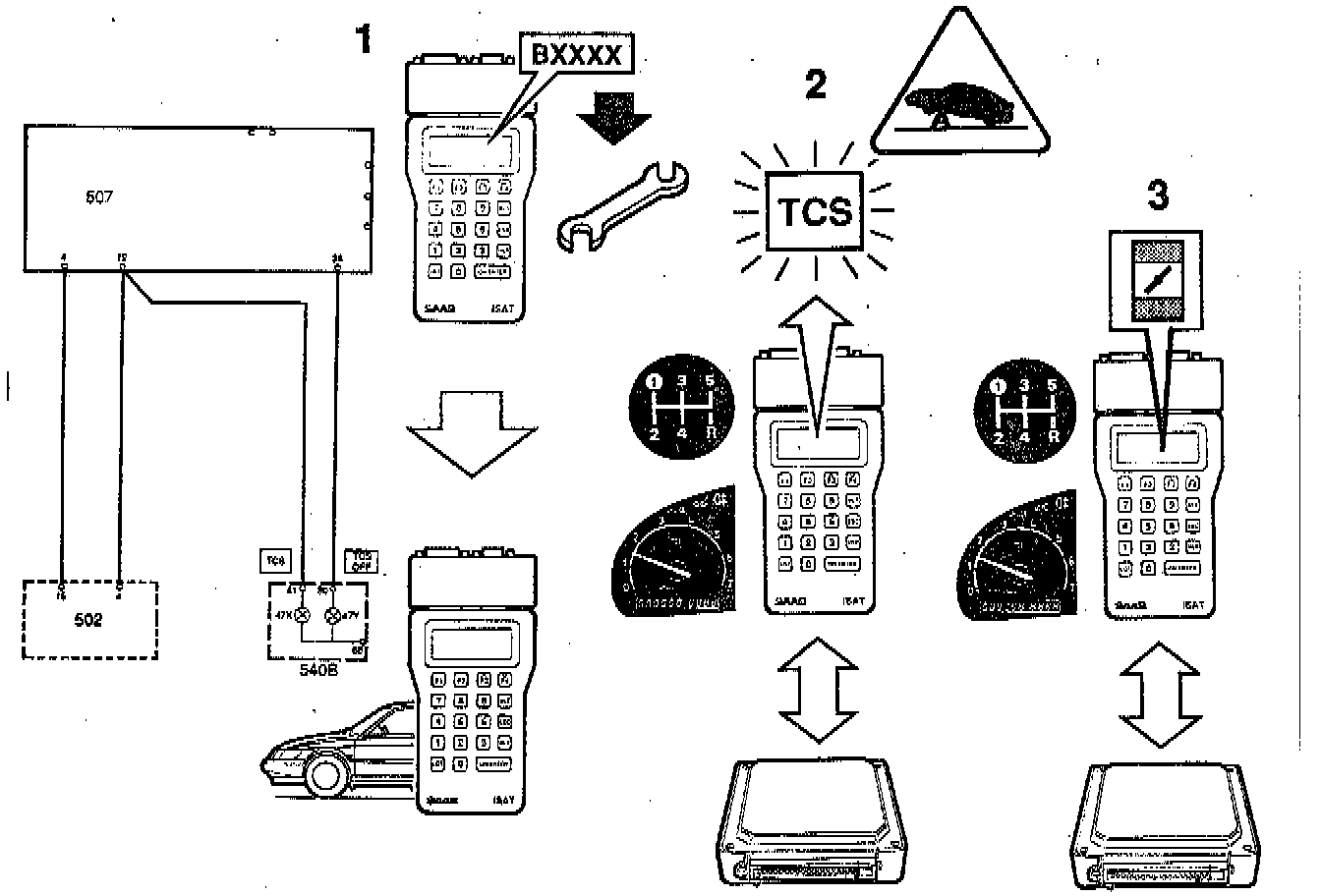 CAUTION: To activate the TCS function, the car can be raised on a garage lift. Proceed with the outmost caution if this method is chosen. If only the front of the car is raised and supported on stands, the handbrake must always be applied and nobody should stand in front of the car or beside the front wheels while the test is in progress. Speed should be restricted to the minimum possible above 4 km/h.