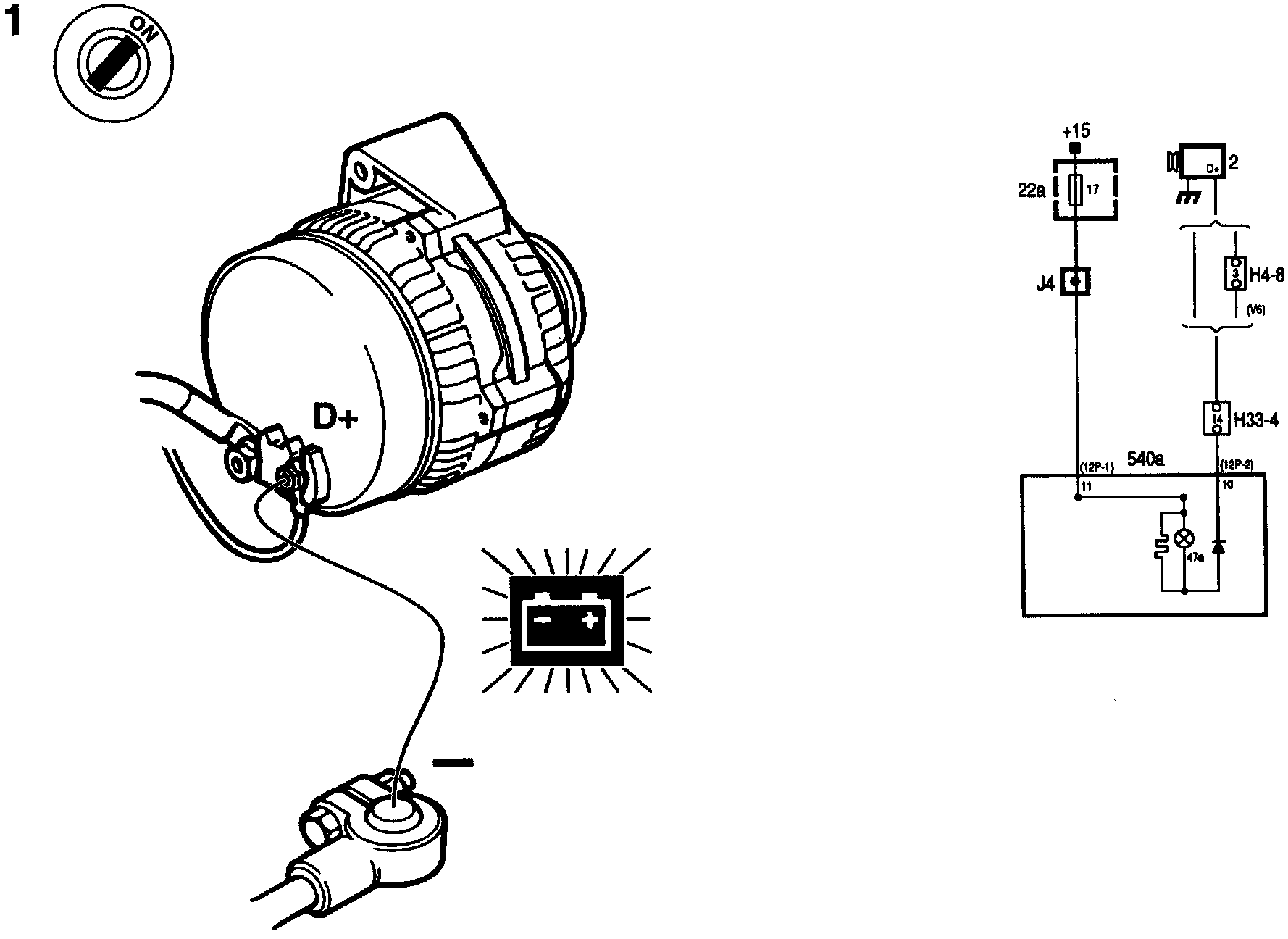 1 Switch on the ignition and ground the D+ terminal on the generator.
