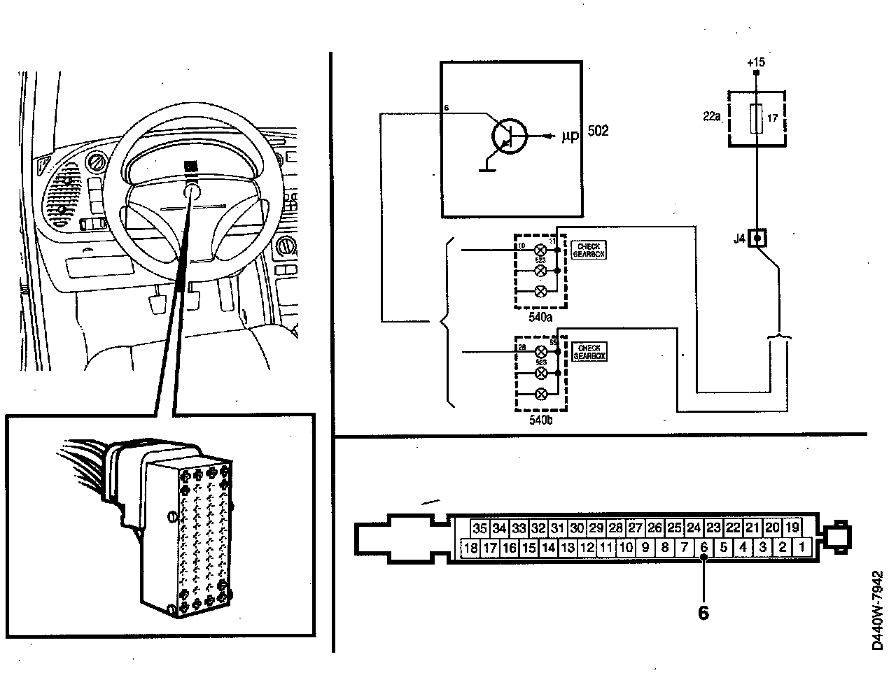 Check The Wiring between pin 6 of the transmission control module and pin 10 (low spec.) or pin 28 (high spec.) of the main instrument display panel for continuity or shorting.