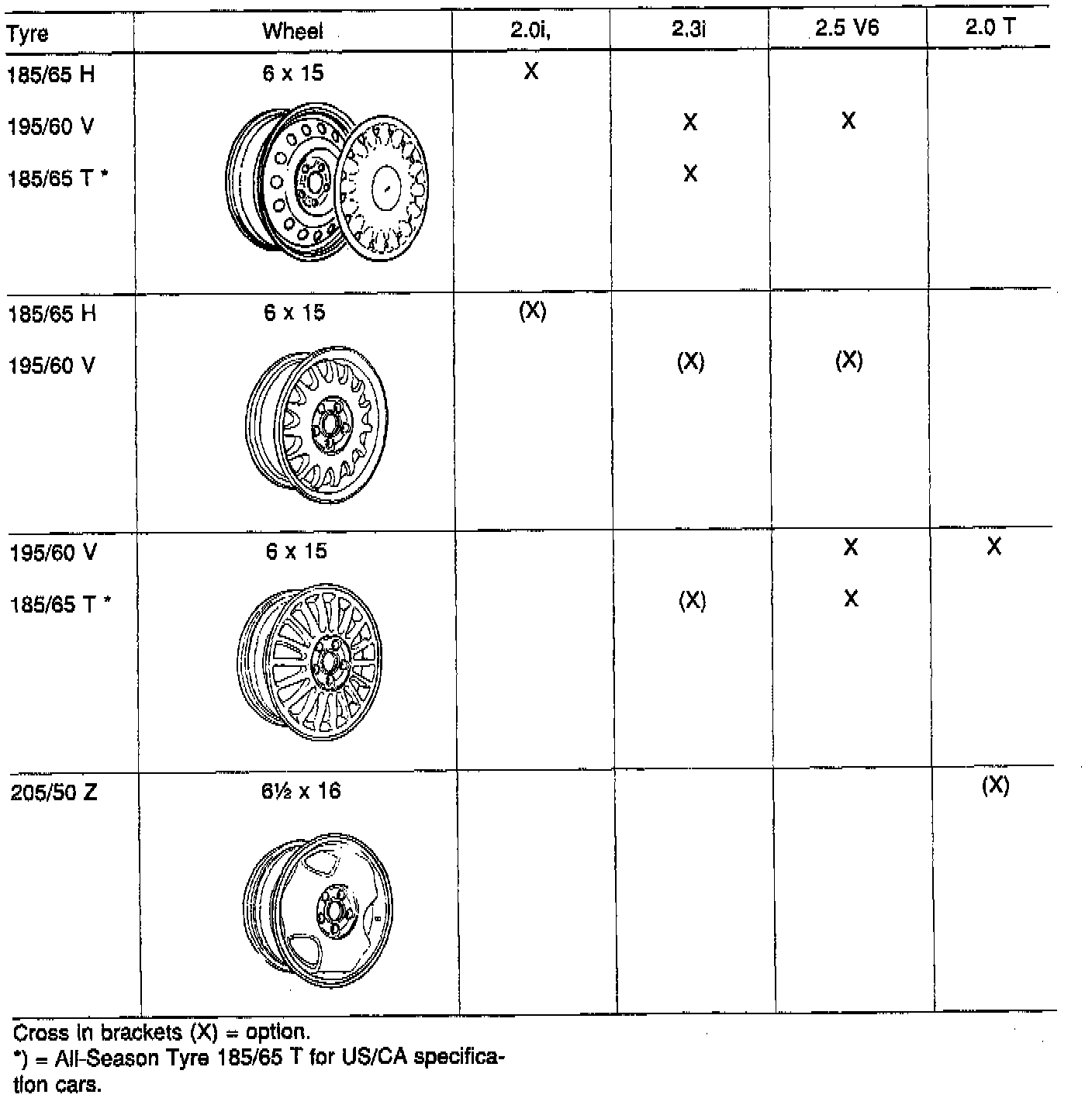 Refer to the illustration for wheel and tire sizes, noting the following: