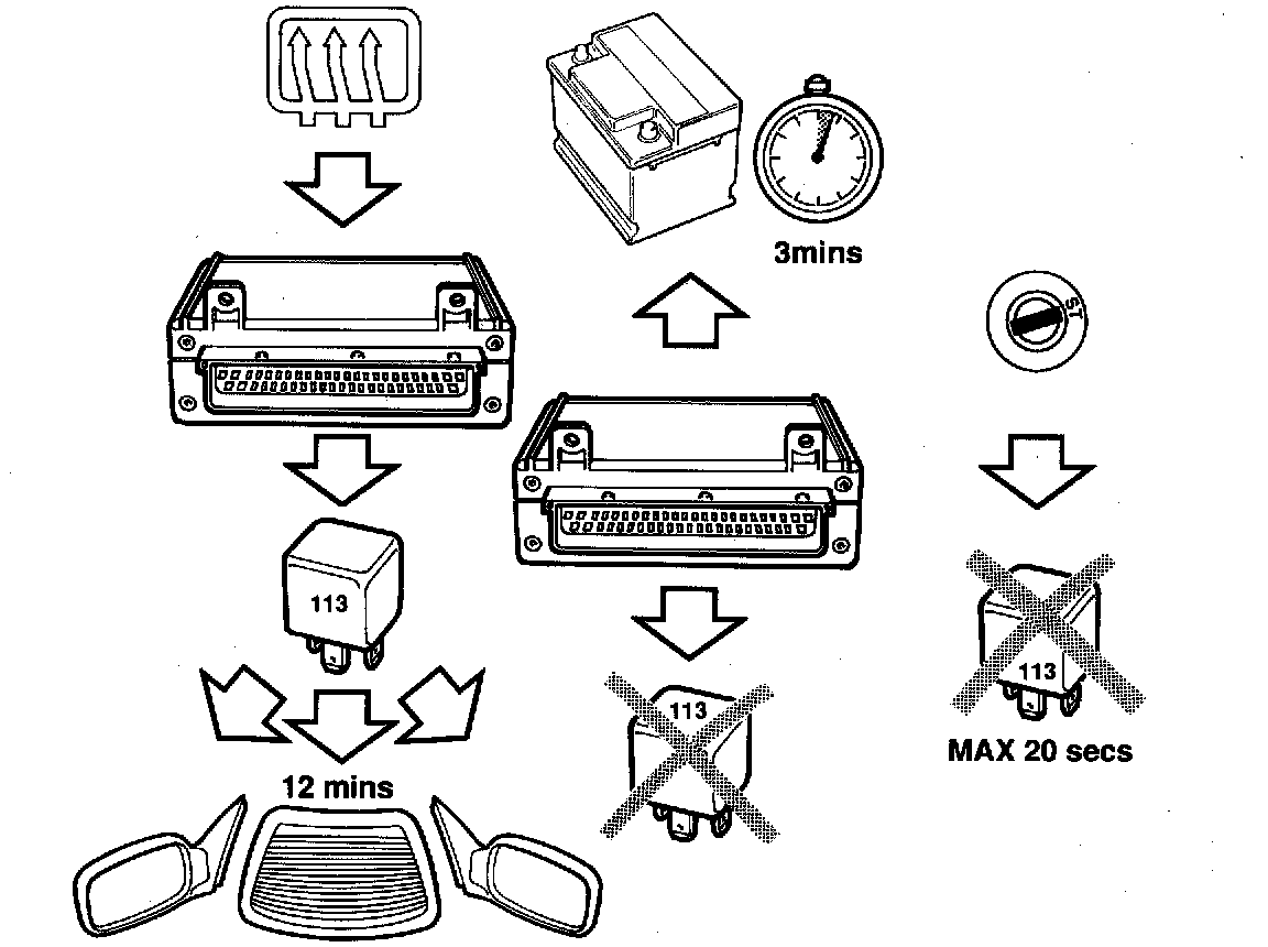On cars with automatic climate control (ACC), power is supplied in the form of a short pulse (100 ms) when the switch on the ACC unit is activated. The Integrated Central Electronics (ICE) module is supplied with power on pin 66 and grounds the electrically heated rear window relay via pin 35, causing power to be supplied to the rear window and the door mirrors.