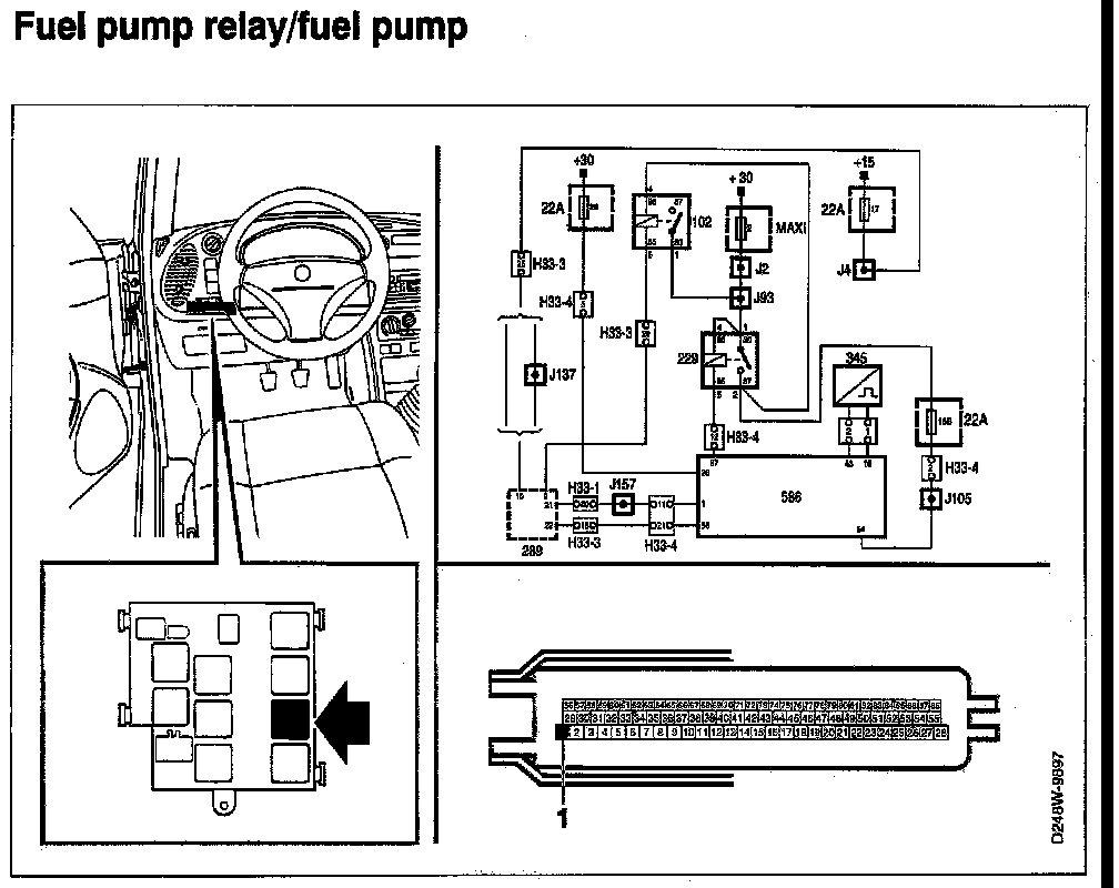 - MAXI fuse 2 (+30 circuit, main pump relay power supply).