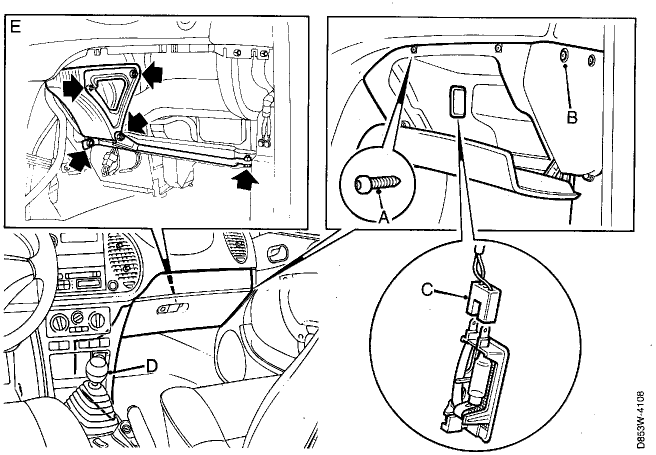 4. Install the expansion rivet, the securing bolt, the retaining screws and the covers on the glove compartment (B and A).