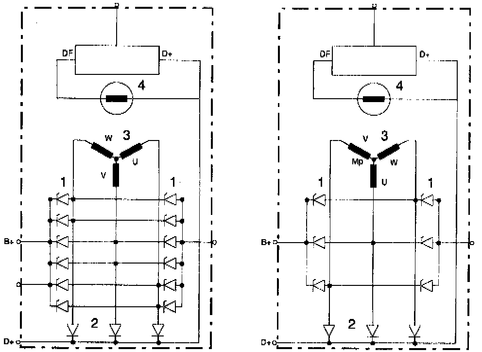 The six (four-cylinder engine) or twelve (V6 engine) rectifier diodes are connected in the form of an a.c. bridge circuit, i.e. three (4-cylinder) or six (V6) diodes are connected for normal polarity (anode to terminal) and three or six for reversed polarity (anode to ground).