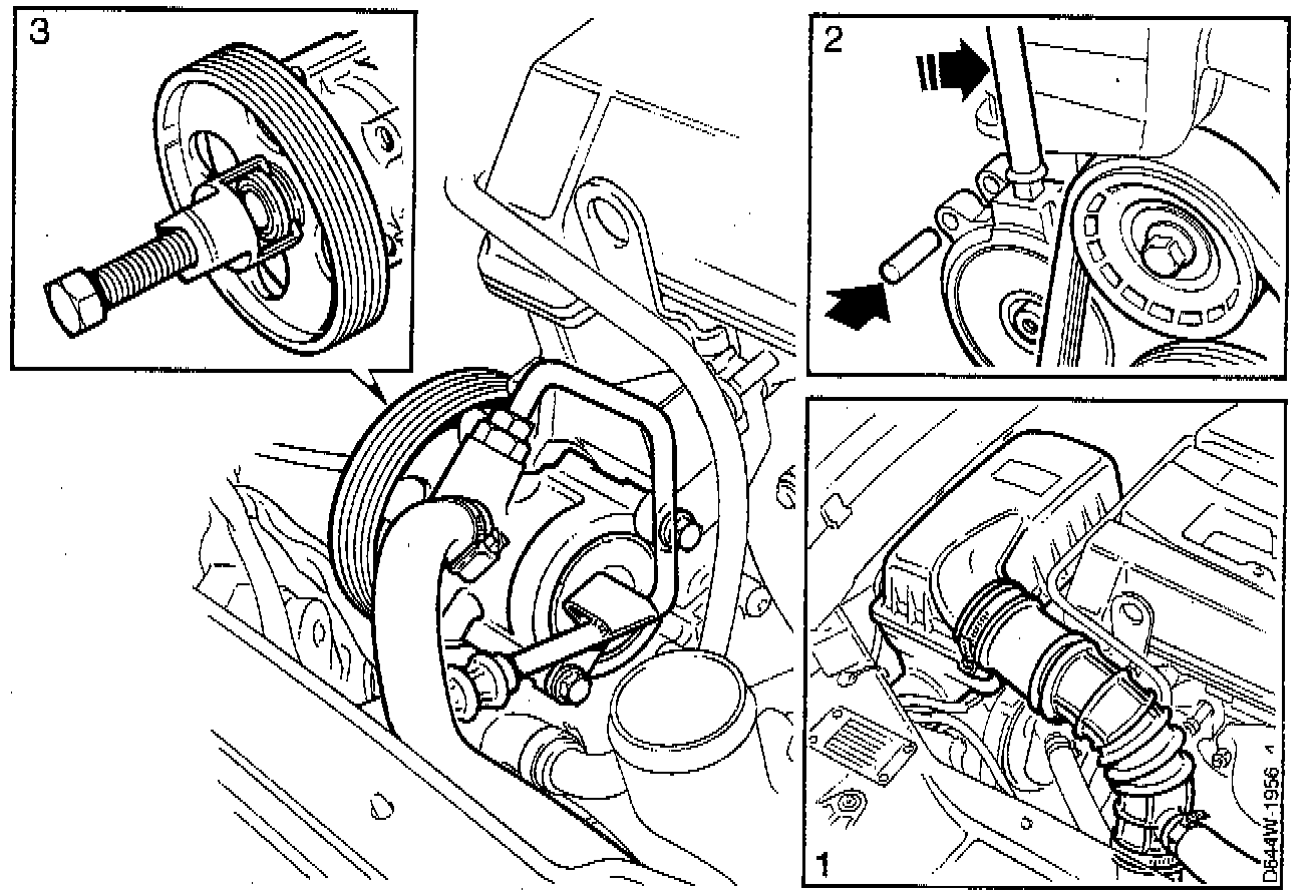 3. Install puller 89 96 423, or equivalent, and remove the pulley (3).
