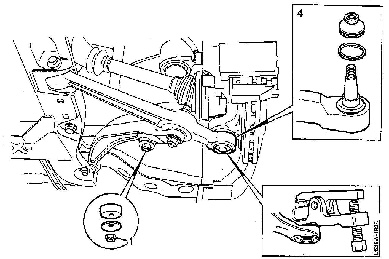 2. Remove the ball joint nut (2). Use special tool 89 96 696 to press the ball joint stud out of the swivel member (3).