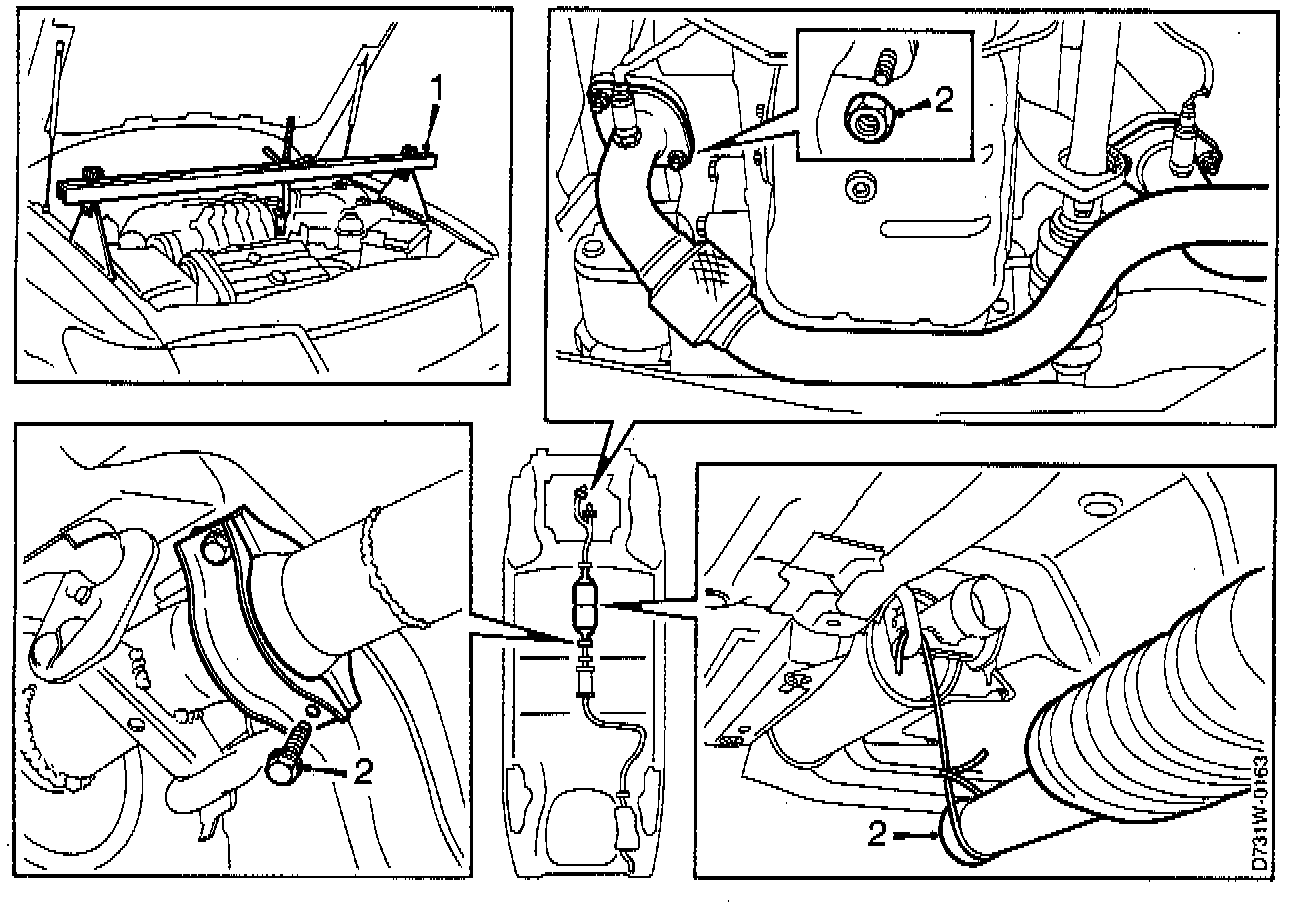 3. Undo the exhaust pipe and suspend it at the rear by means of steel wire (2).