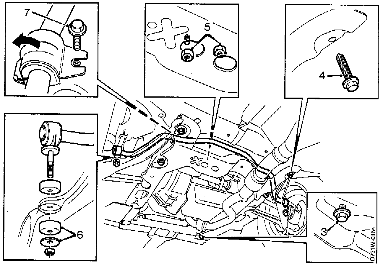 5. Install the rubber bushes and retaining nuts for the anti-roll bar (6).