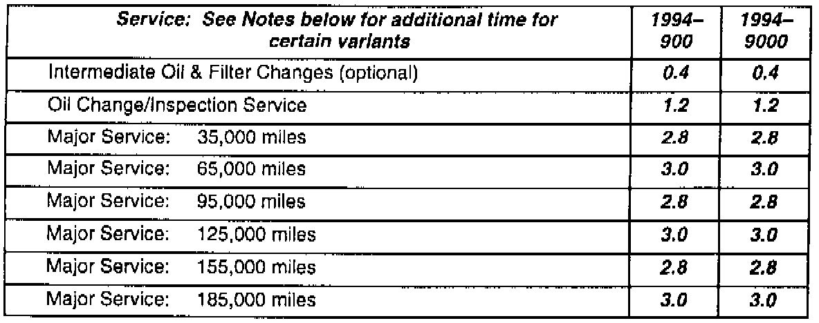 **Listed below are the times you can use in developing a Service Menu for the 1994, 1995 and 1996 900 models for your Dealership (times for 9000 remain the same from 1993 but for your convenience have been included):**