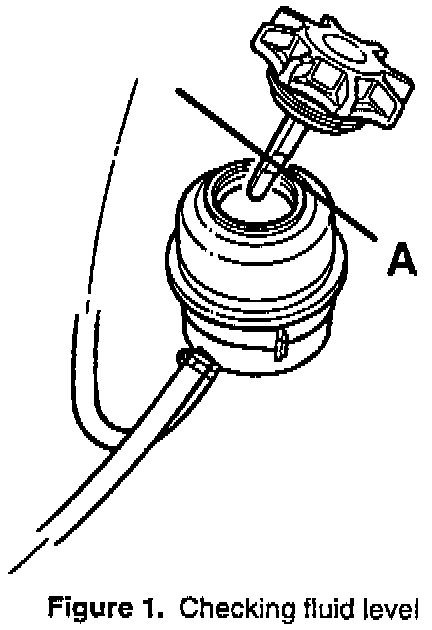 3. Check the level of the fluid. It should be between the MAX and MIN marks on the dipstick fitted to the cap of the fluid reservoir. See Figure 1, item A.